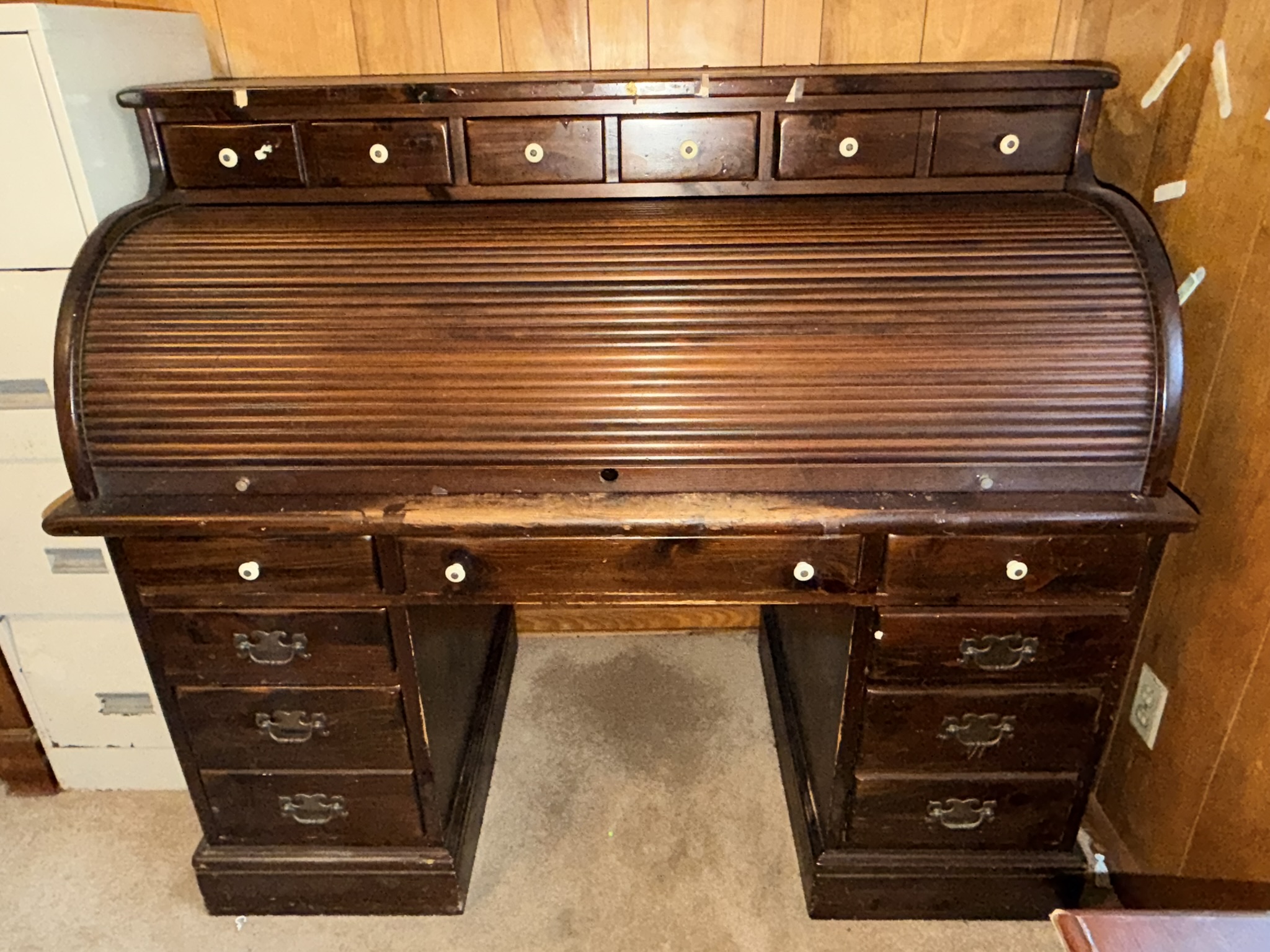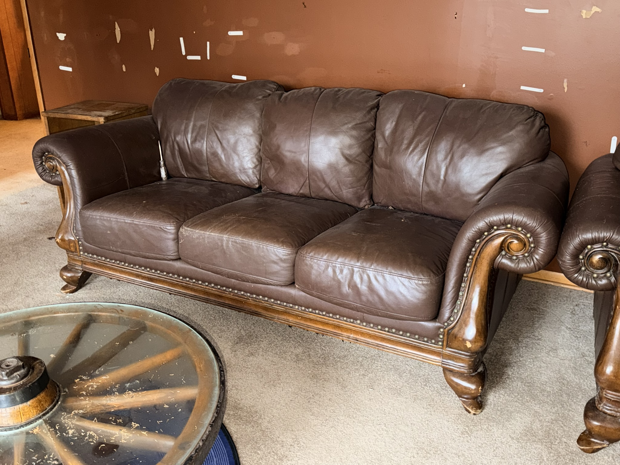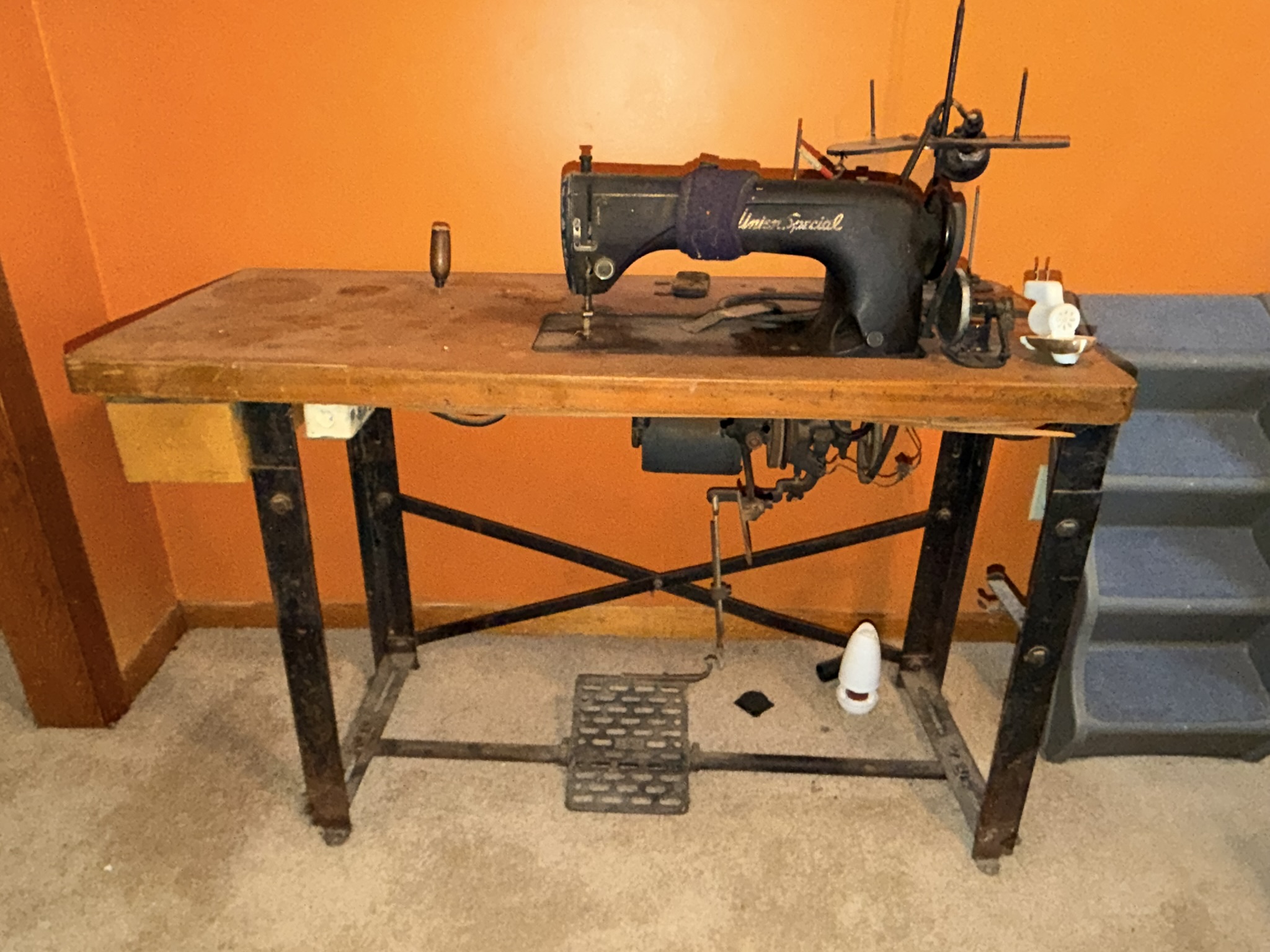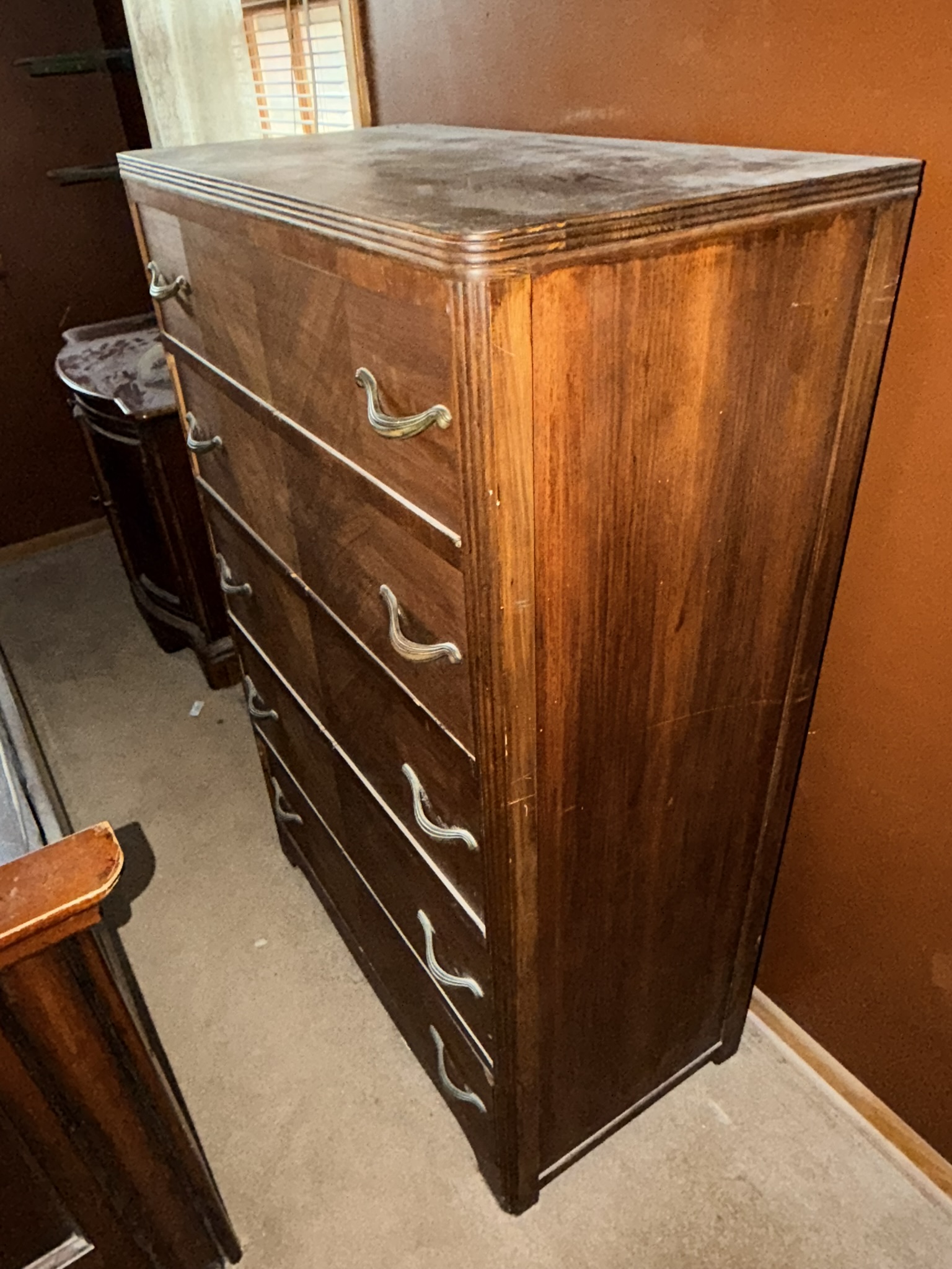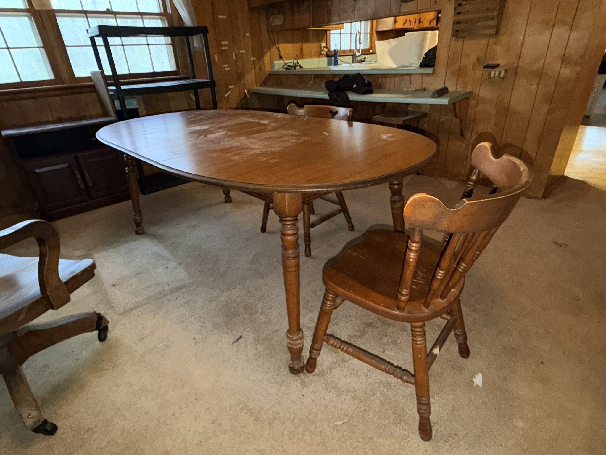 TV stand / entertainment cabinet, leather sofa and recliner, butcher block kitchen table, plastic shelving, dining room table with two chairs, bookshelves, end tables, horseshoe shelf, coat racks, leather sofa and chair, children’s vintage school desk, roll-top desk, Young Republic solid maple China hutch, wagon wheel coffee table, four-drawer filing cabinet, five-piece king bedroom set, antique Union Special sewing machine table, full bed with dresser, full bed with vanity dresser, cedar trunk.