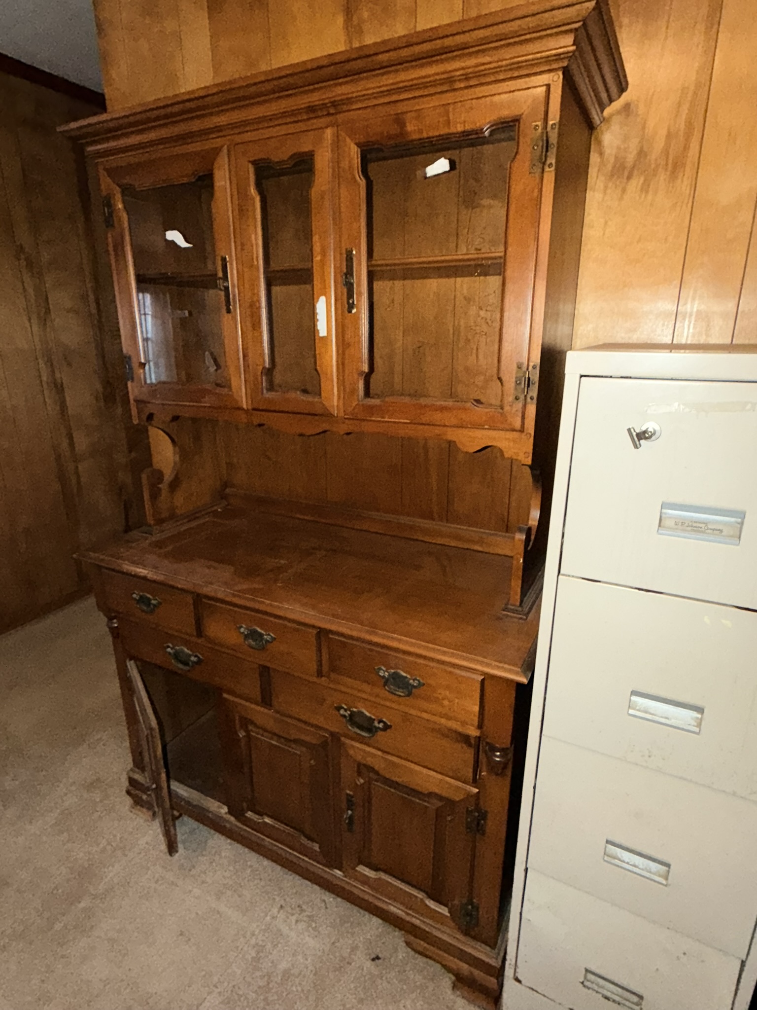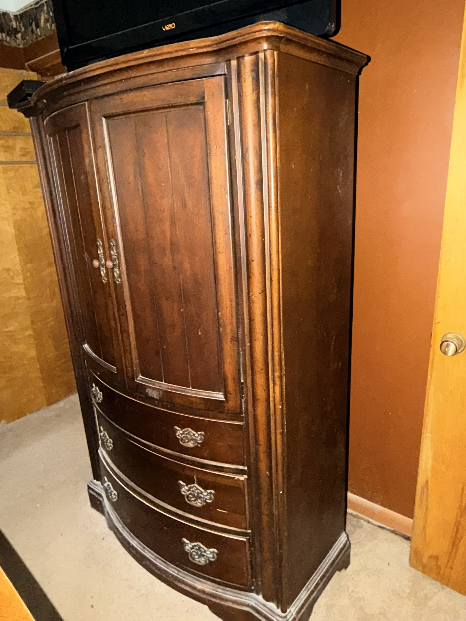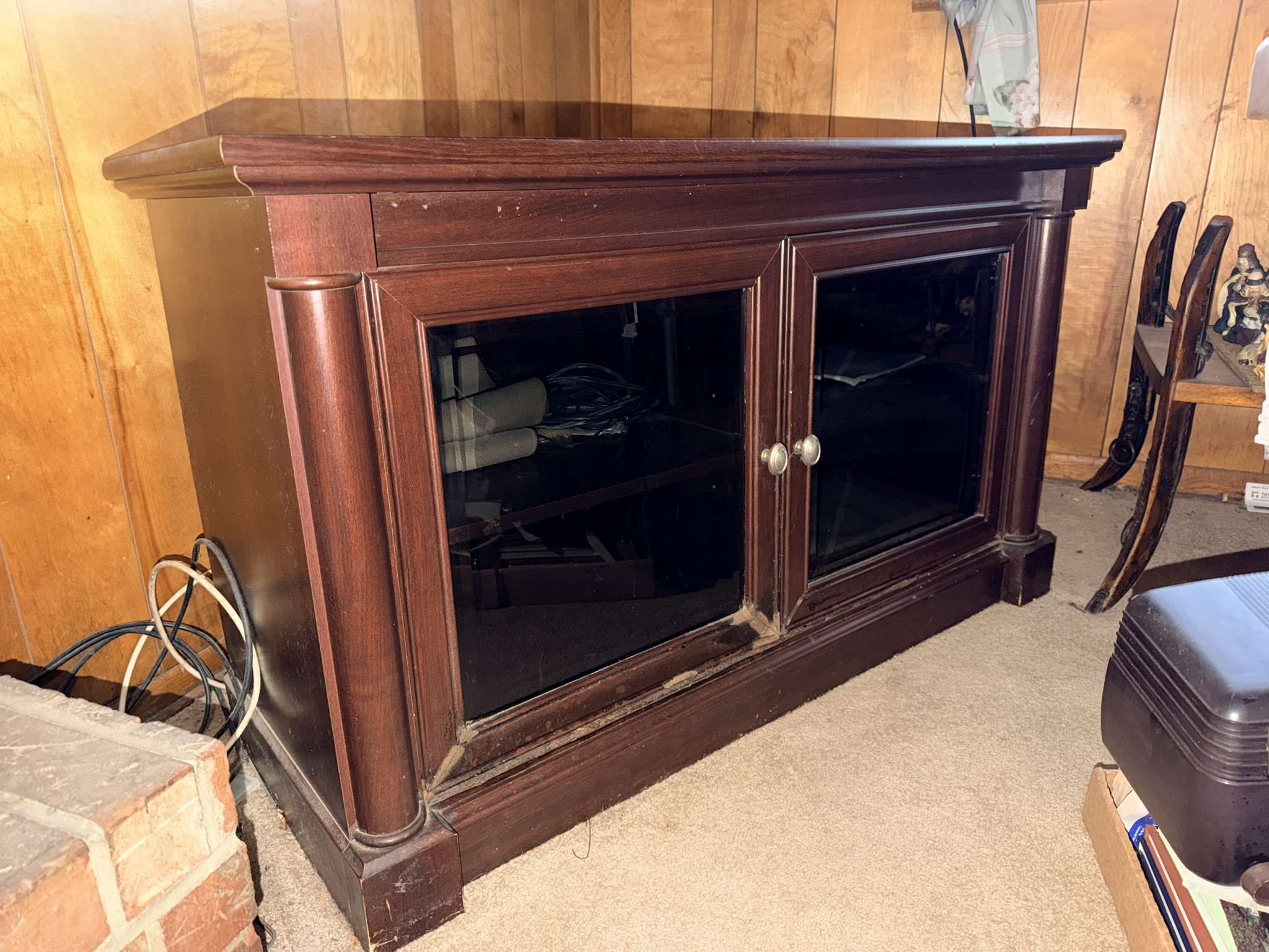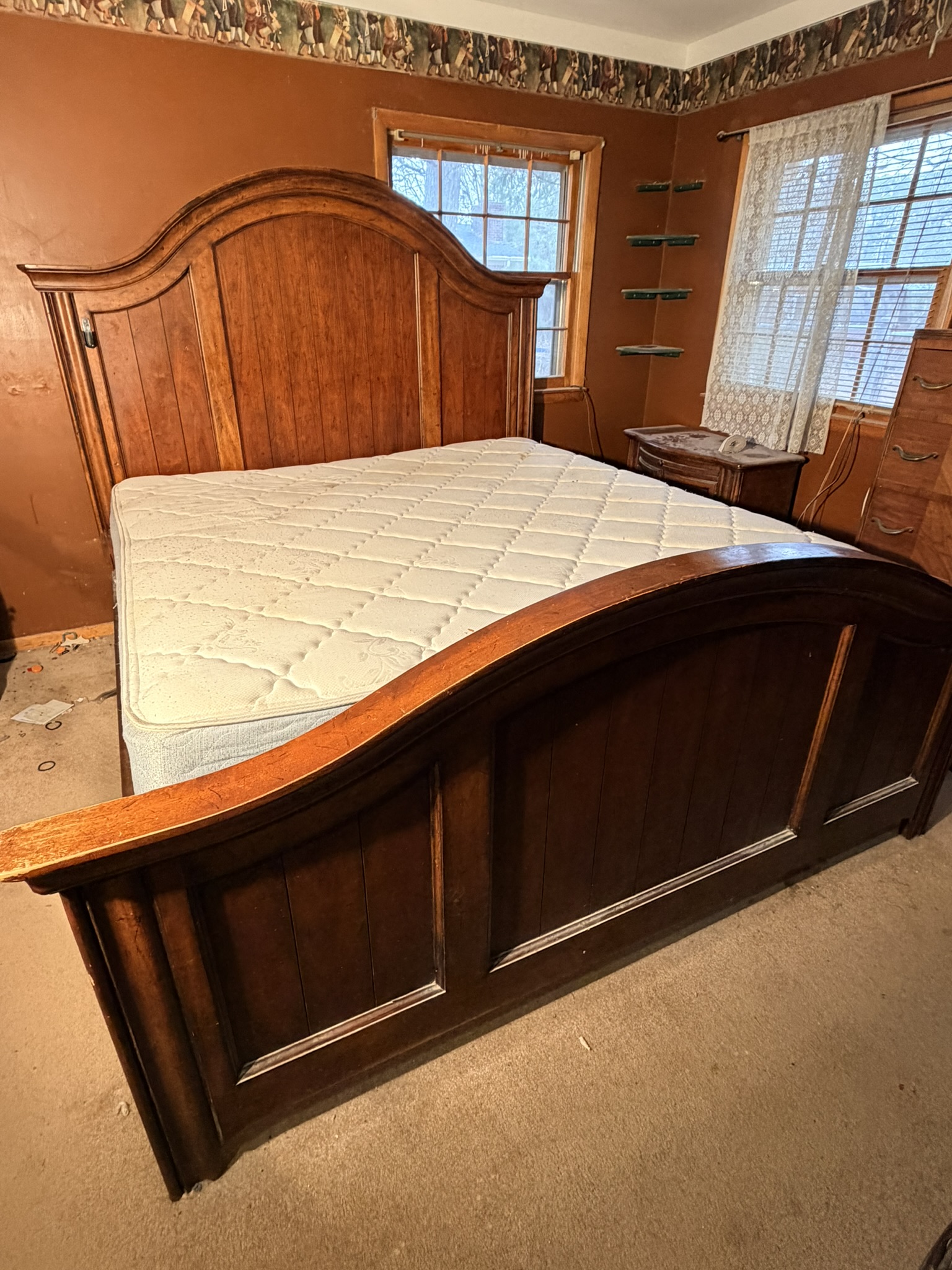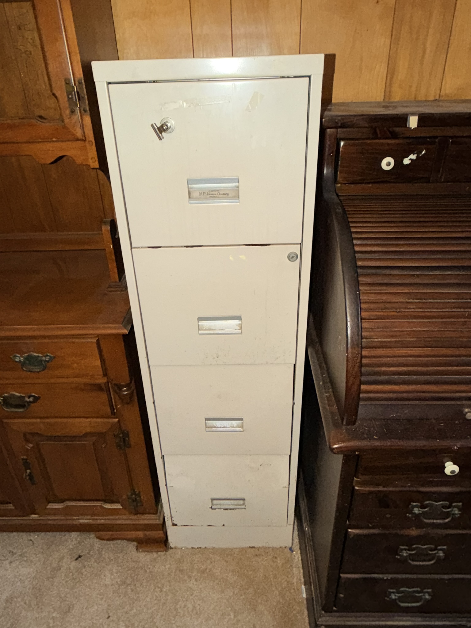 TV stand / entertainment cabinet, leather sofa and recliner, butcher block kitchen table, plastic shelving, dining room table with two chairs, bookshelves, end tables, horseshoe shelf, coat racks, leather sofa and chair, children’s vintage school desk, roll-top desk, Young Republic solid maple China hutch, wagon wheel coffee table, four-drawer filing cabinet, five-piece king bedroom set, antique Union Special sewing machine table, full bed with dresser, full bed with vanity dresser, cedar trunk.