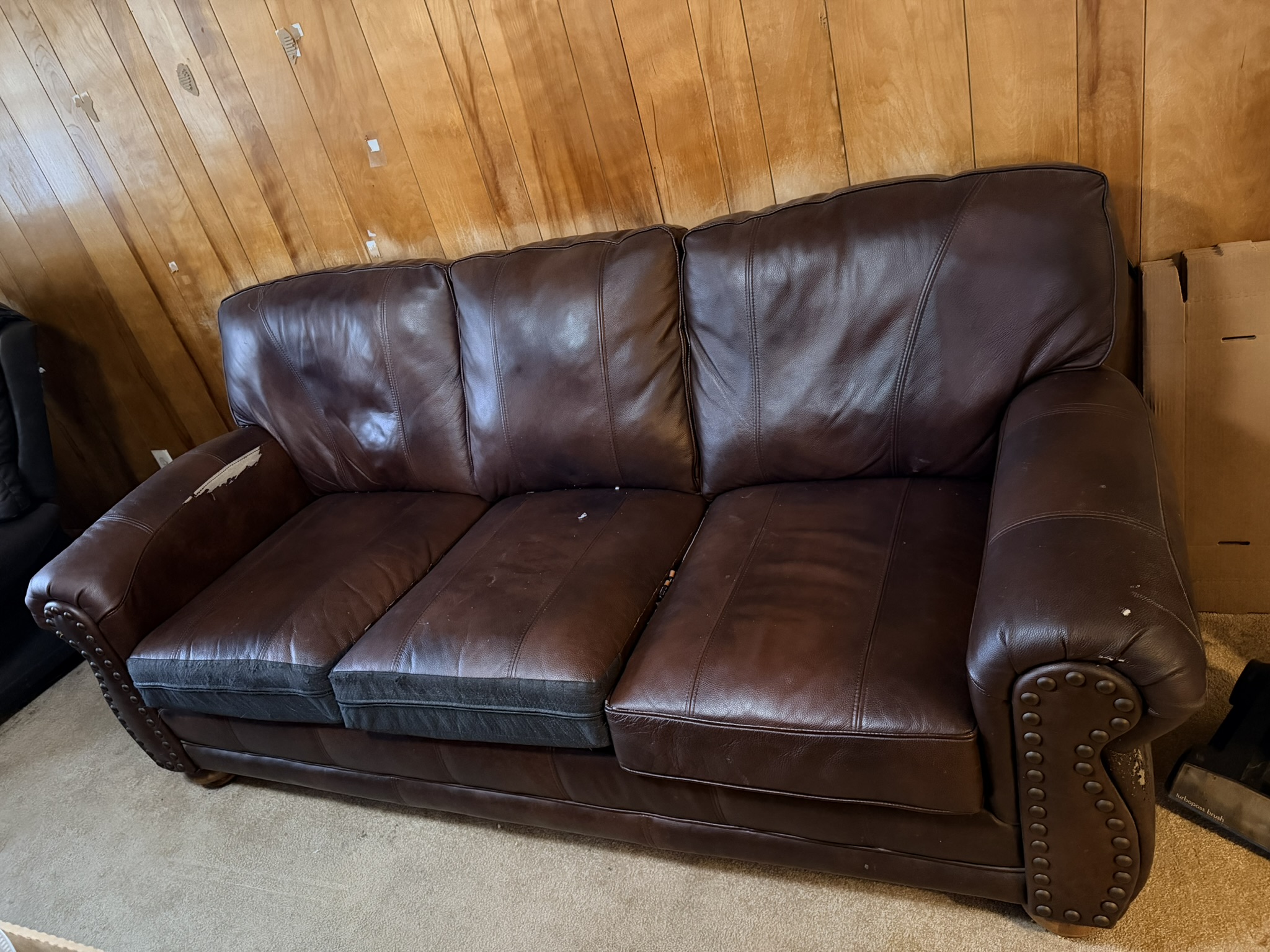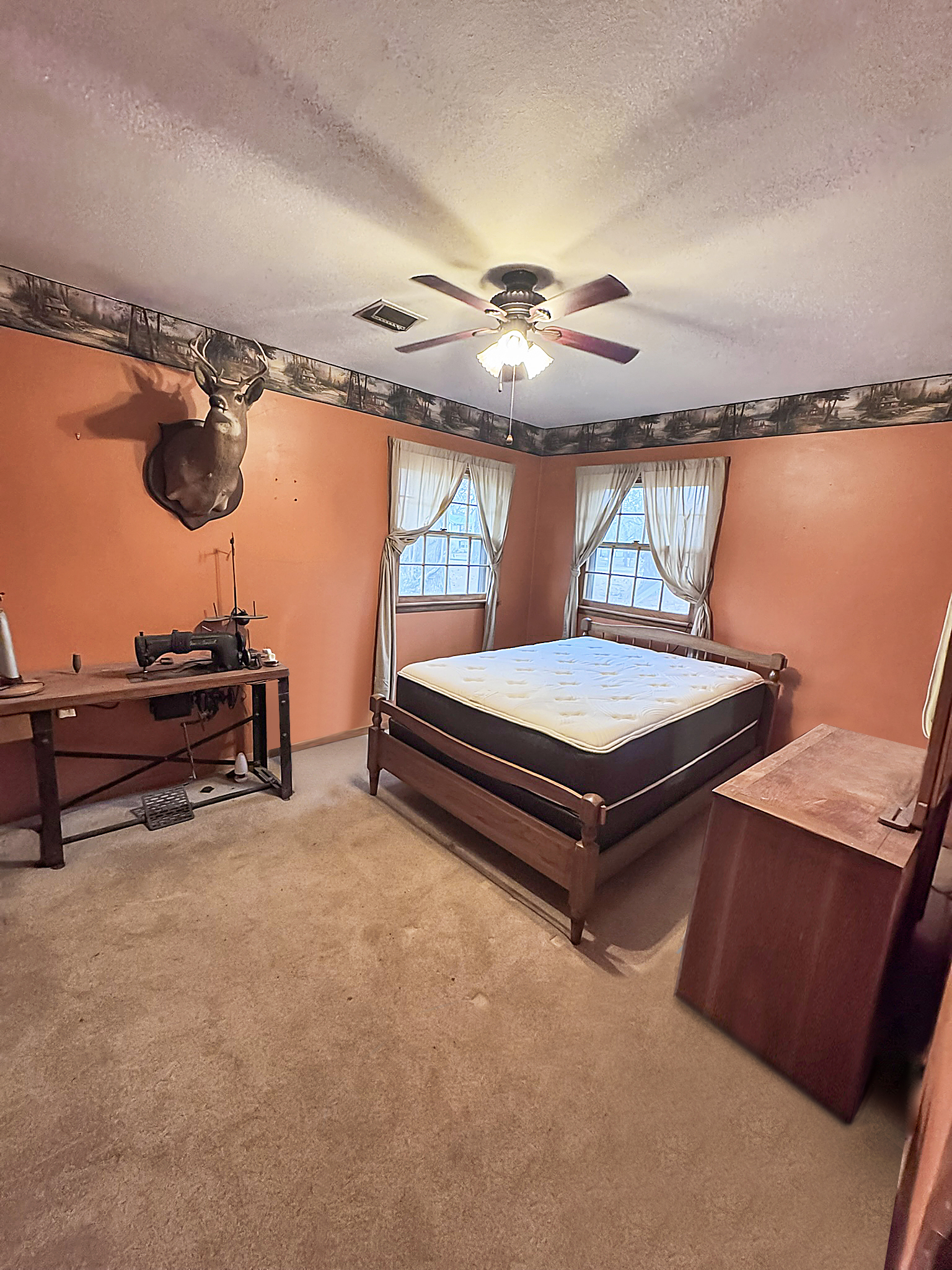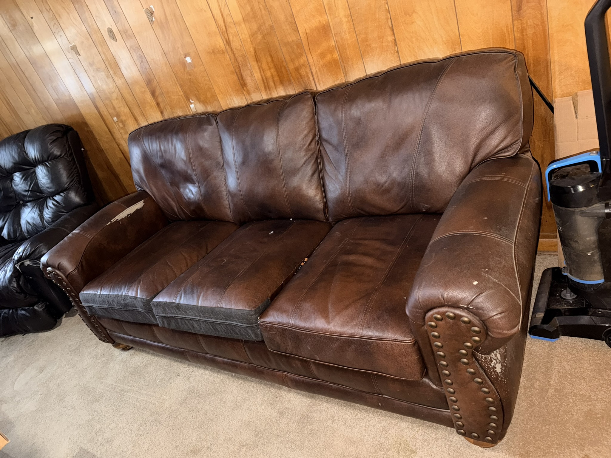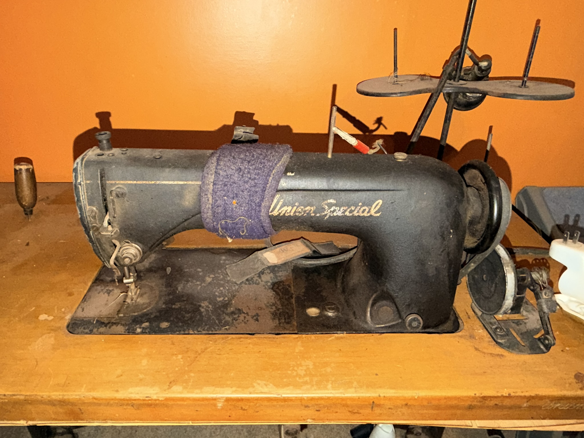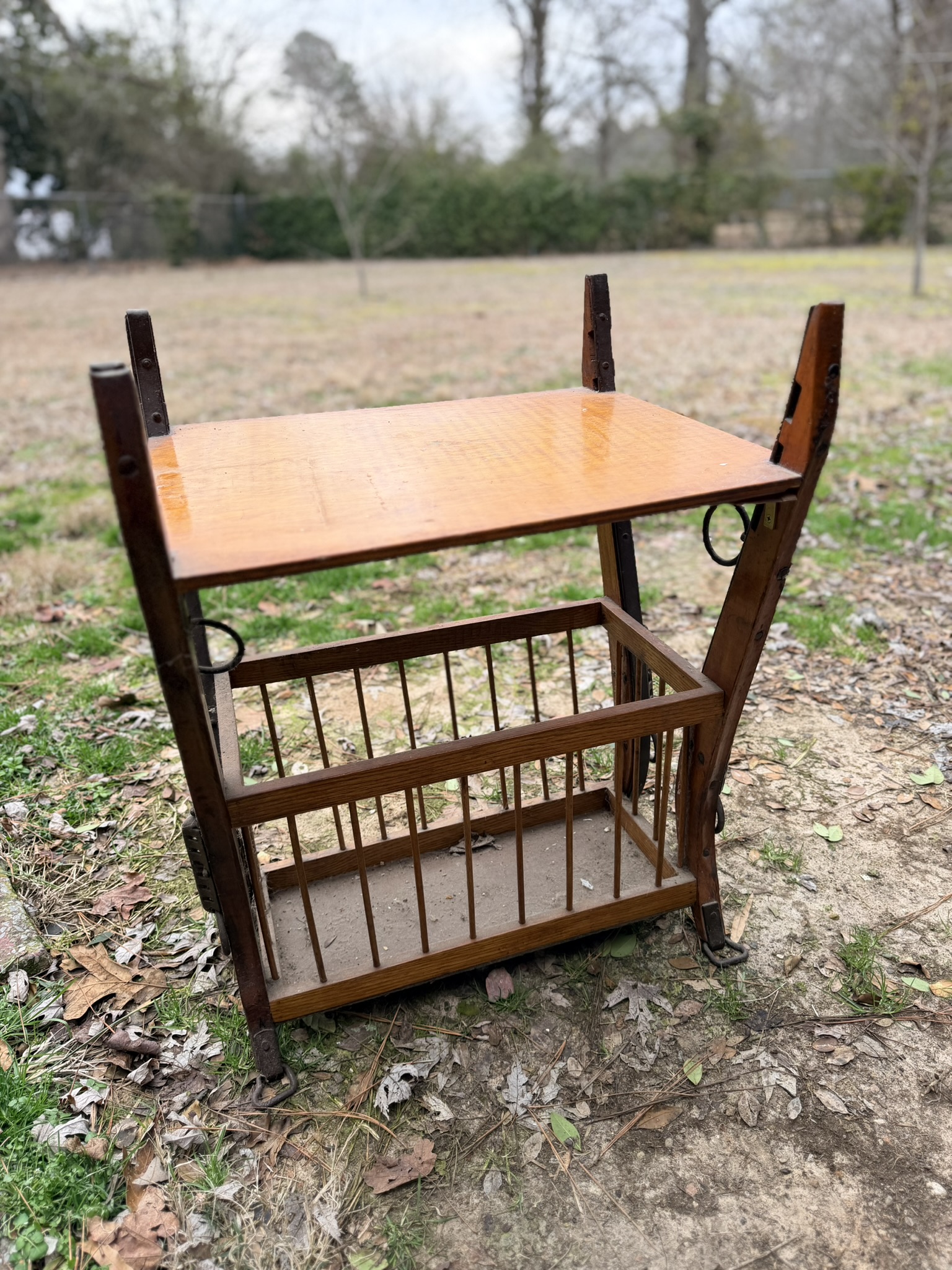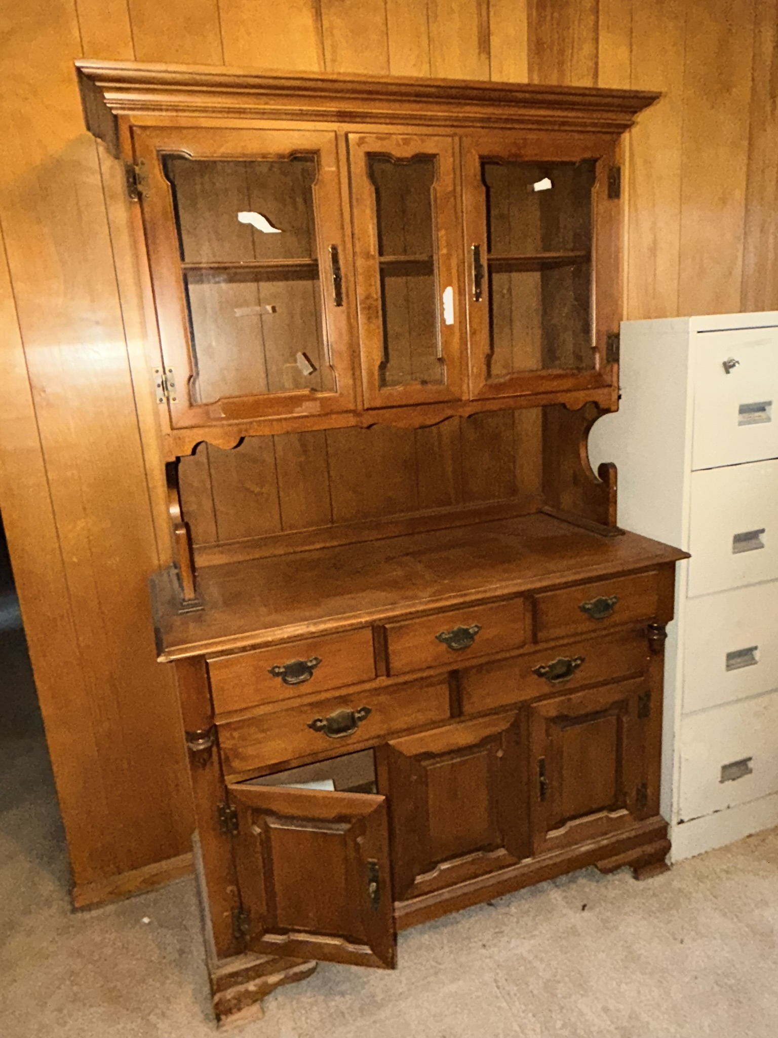 TV stand / entertainment cabinet, leather sofa and recliner, butcher block kitchen table, plastic shelving, dining room table with two chairs, bookshelves, end tables, horseshoe shelf, coat racks, leather sofa and chair, children’s vintage school desk, roll-top desk, Young Republic solid maple China hutch, wagon wheel coffee table, four-drawer filing cabinet, five-piece king bedroom set, antique Union Special sewing machine table, full bed with dresser, full bed with vanity dresser, cedar trunk.