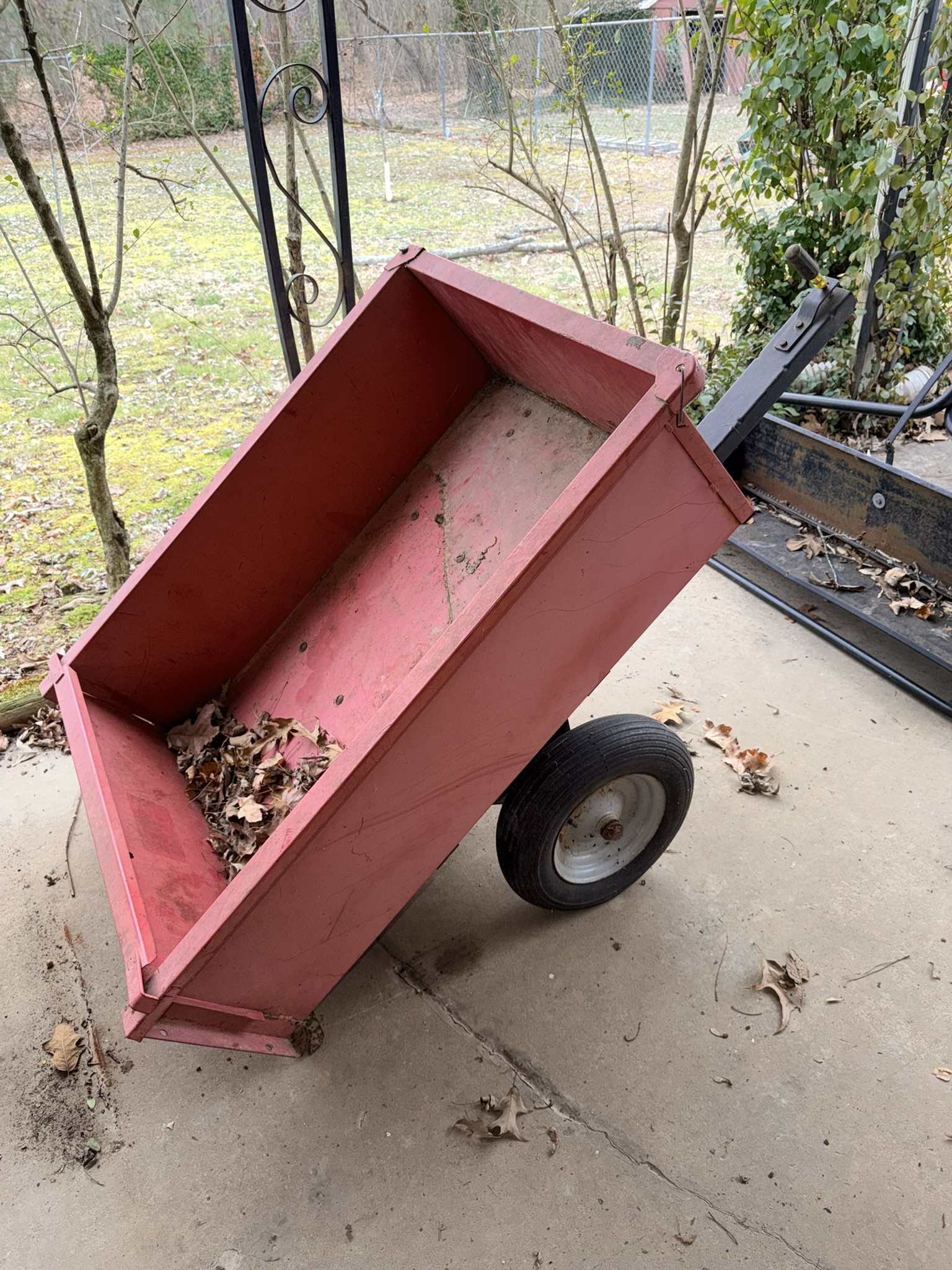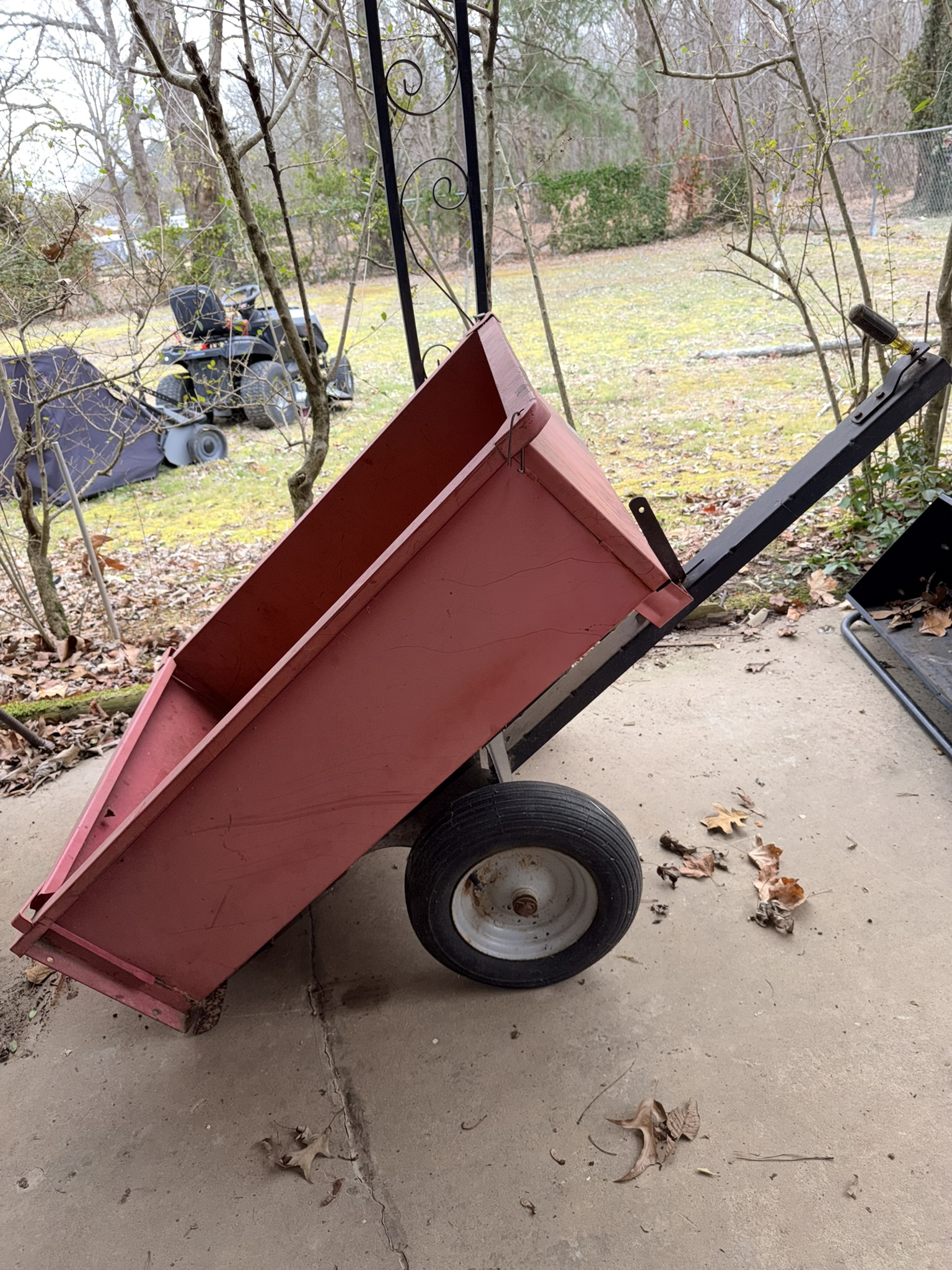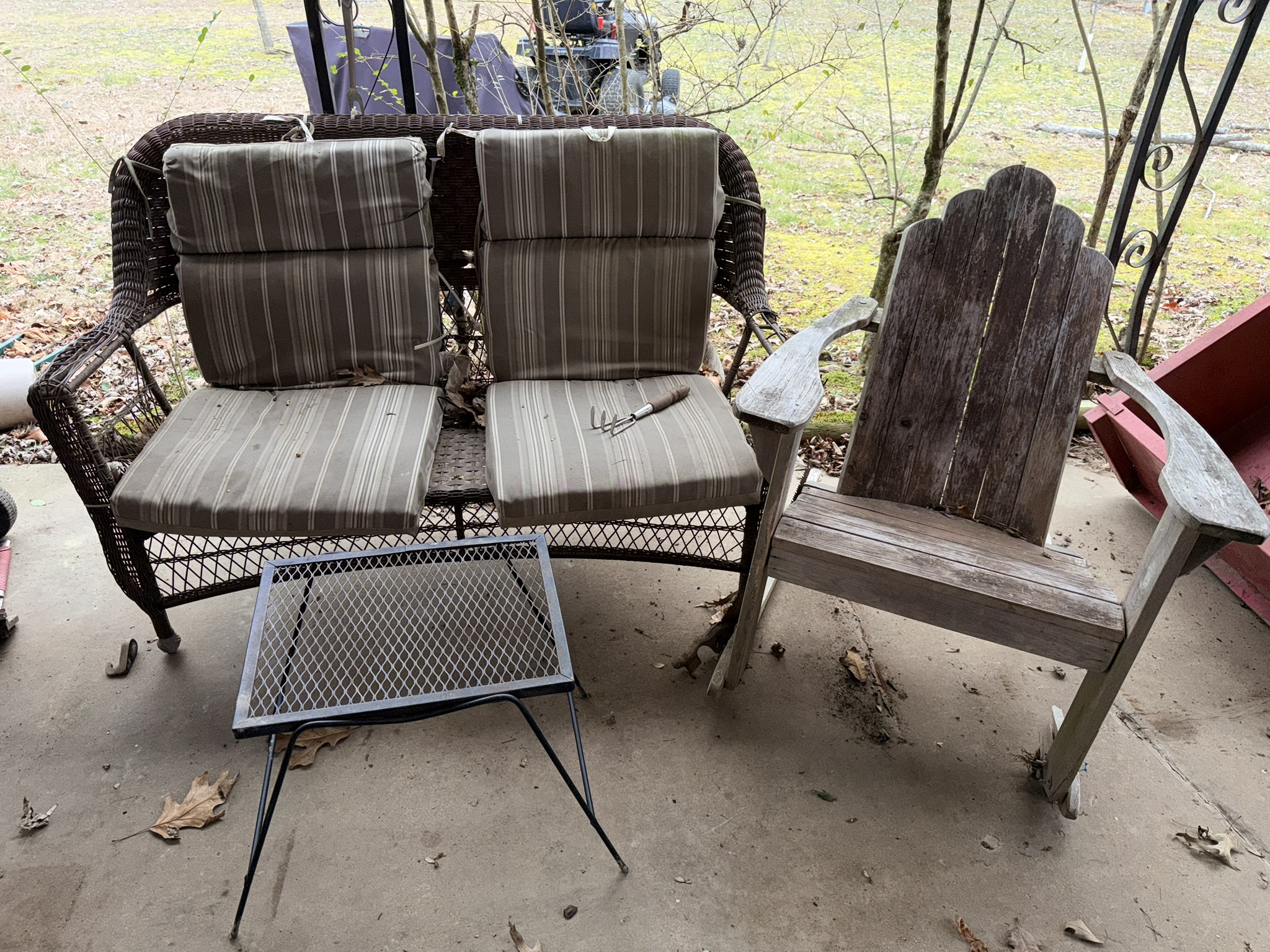 Murray MT100 42” lawn mower (SN: 202208002375), tow-behind wagon trailer (4×8), pull-behind garden cart, Brinly-Hardy pull-behind aerator, All-Fit pull-behind leaf sweep, lawn ornaments including birdhouses, statues, windchimes, wooden rocker, plastic chairs, wicker couch and chairs, patio firepit, Quick Court basketball goal, snow sled, garden hose with plastic reel, garden seeder, concrete birdbath, NexGrill stainless propane grill, wheelbarrow, yard ornaments including horse-drawn walking plow, horse-drawn corn planter, metal wheelbarrow, wagon wheel décor, outdoor swing.