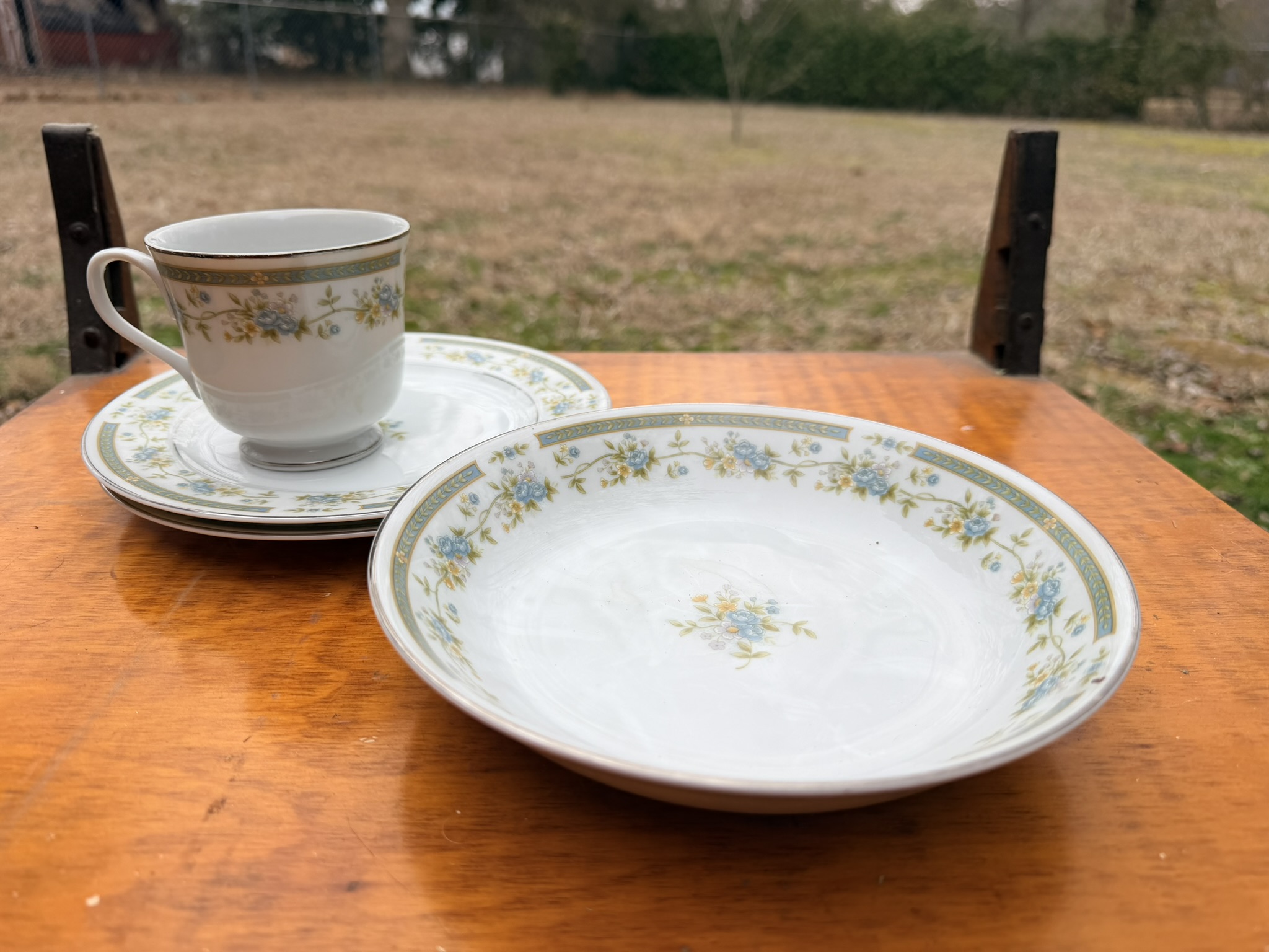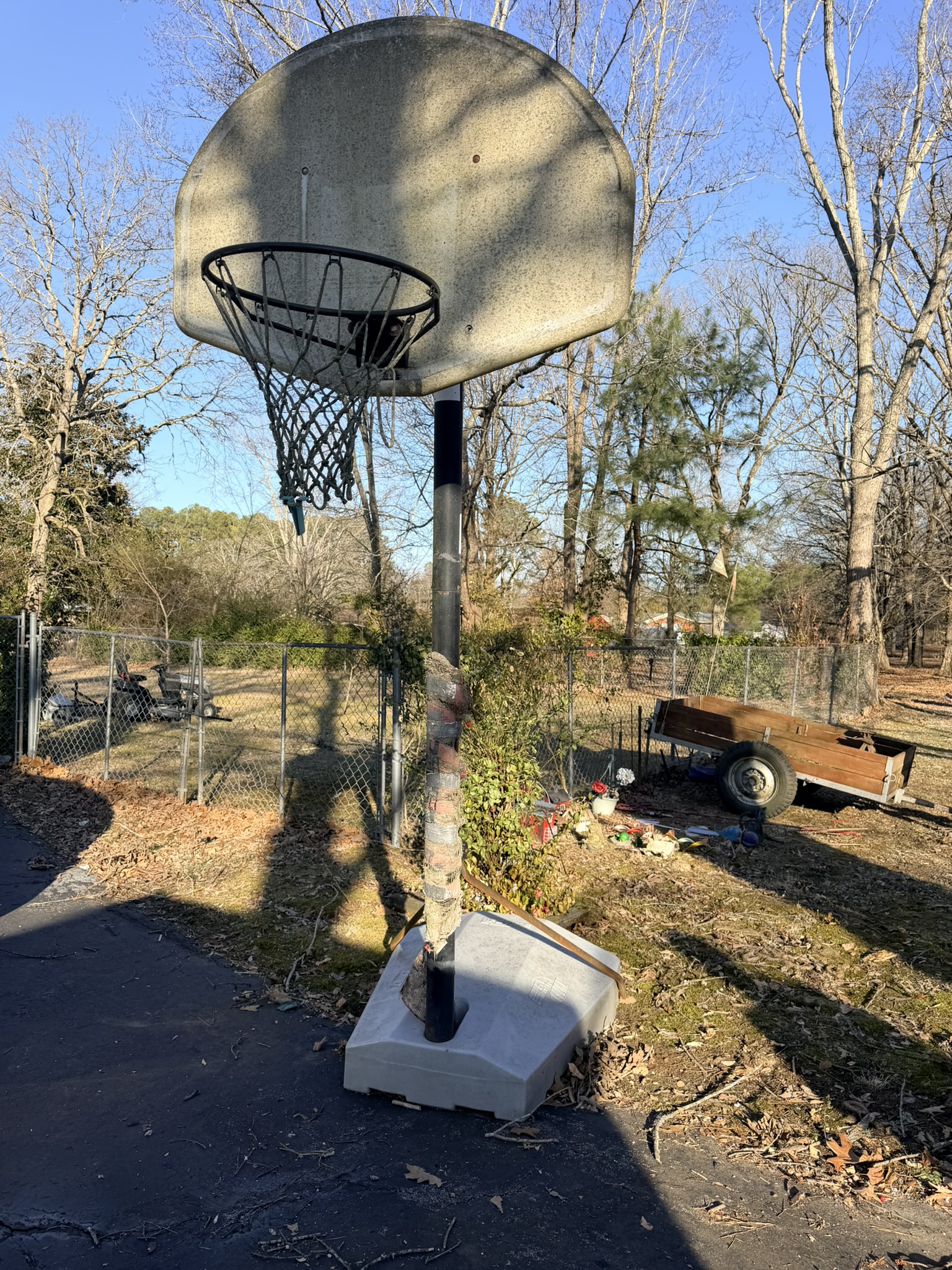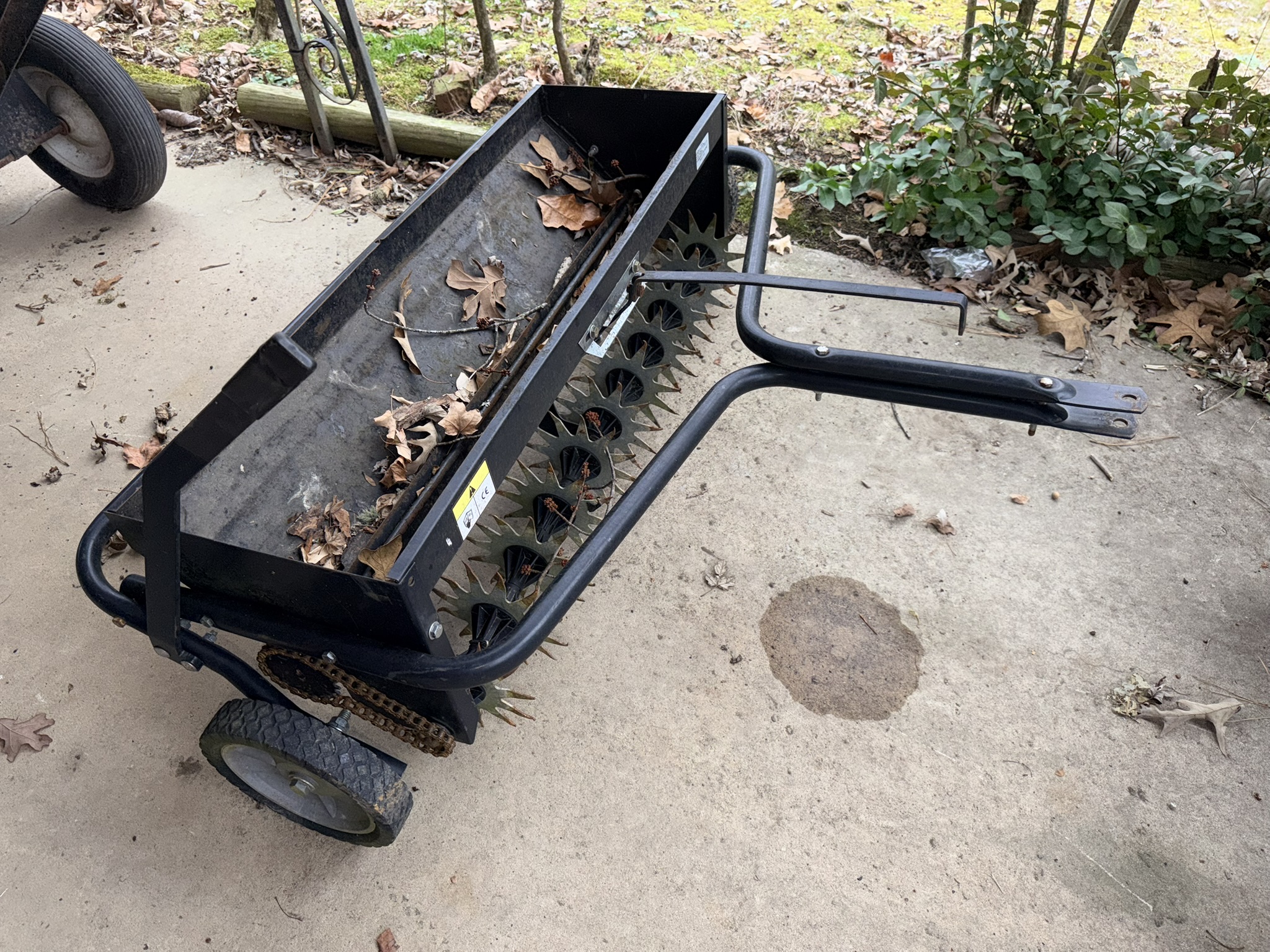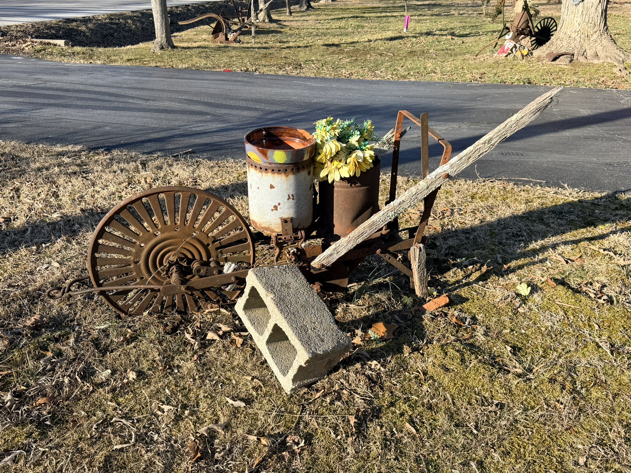 Murray MT100 42” lawn mower (SN: 202208002375), tow-behind wagon trailer (4×8), pull-behind garden cart, Brinly-Hardy pull-behind aerator, All-Fit pull-behind leaf sweep, lawn ornaments including birdhouses, statues, windchimes, wooden rocker, plastic chairs, wicker couch and chairs, patio firepit, Quick Court basketball goal, snow sled, garden hose with plastic reel, garden seeder, concrete birdbath, NexGrill stainless propane grill, wheelbarrow, yard ornaments including horse-drawn walking plow, horse-drawn corn planter, metal wheelbarrow, wagon wheel décor, outdoor swing.