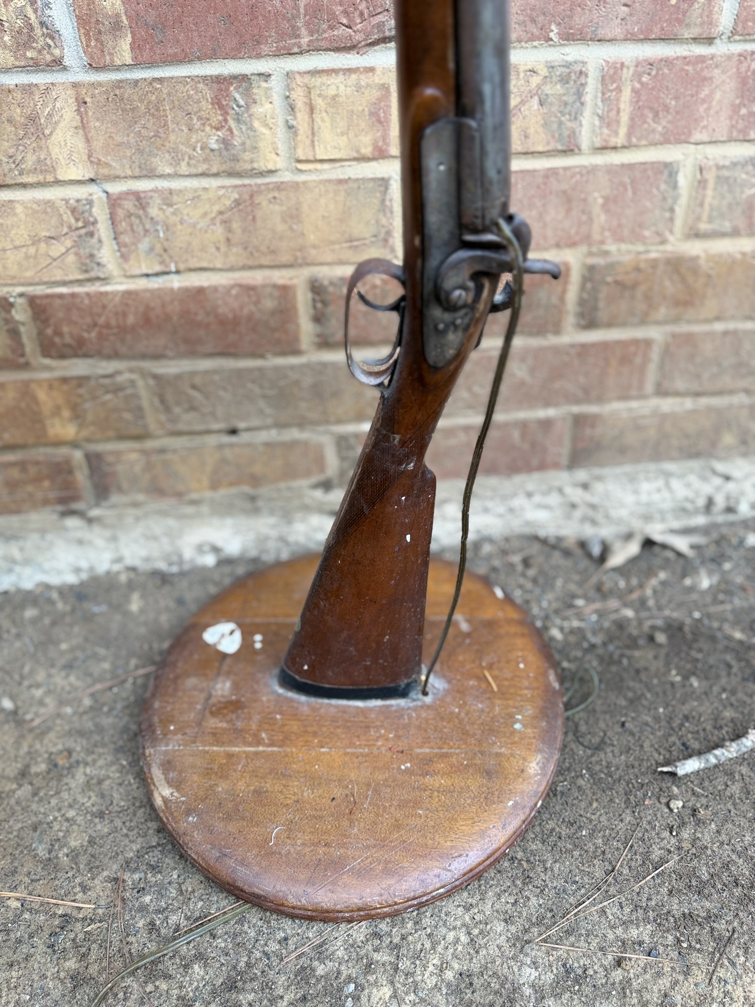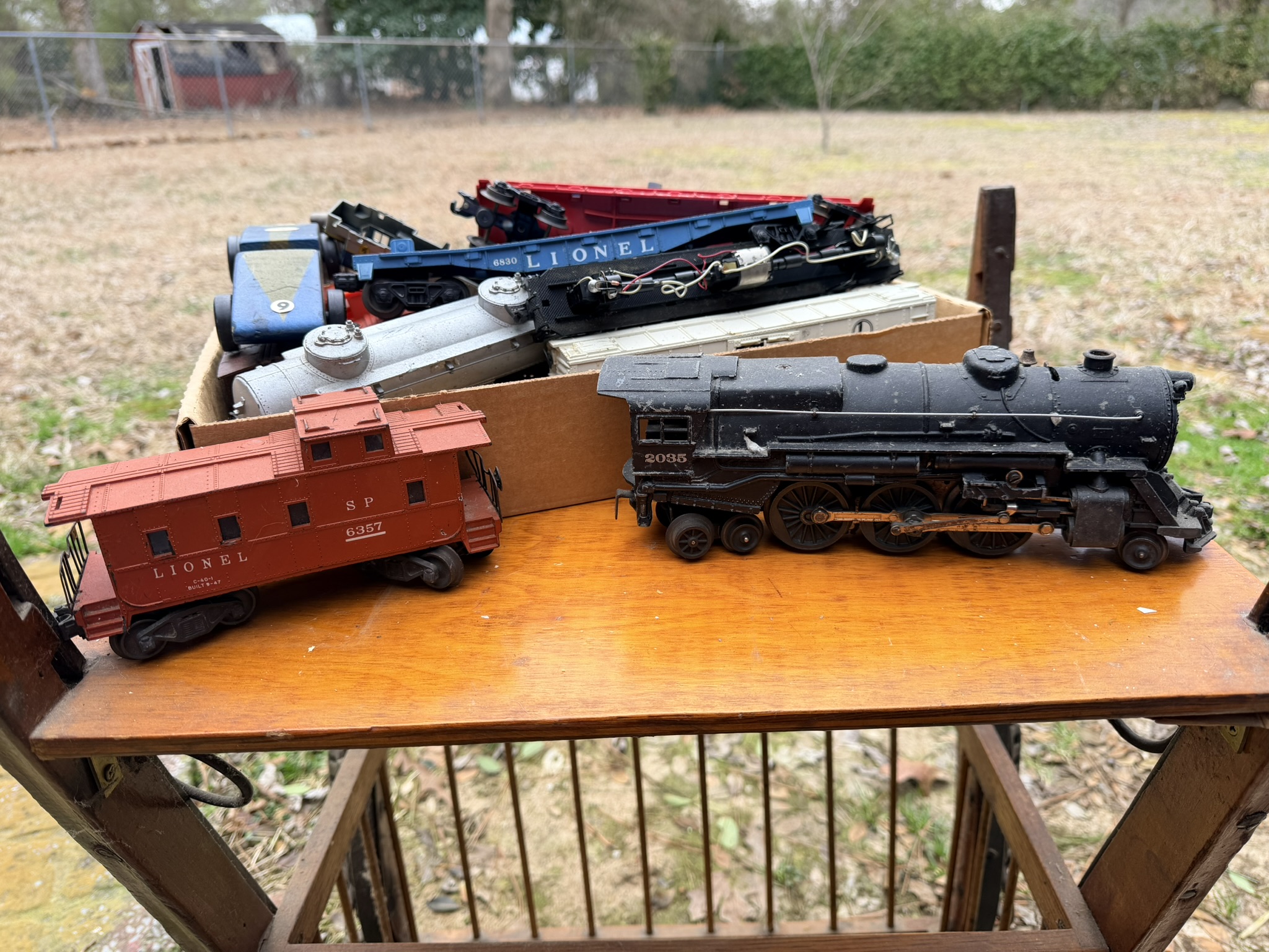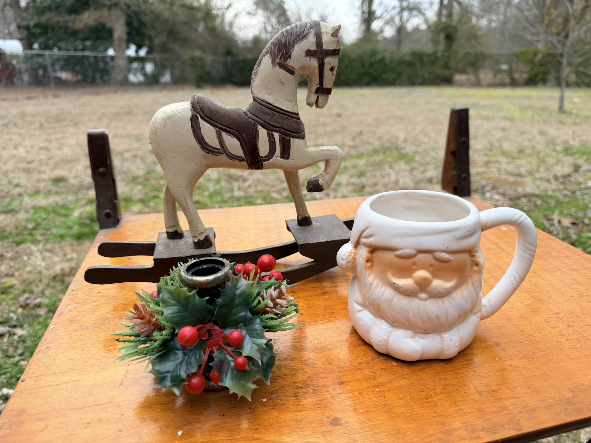 Side-by-side shotgun floor lamp, wooden wall gun shelf, wagon wheel tabletop lamp, kitchen necessities including pots, pans, casserole bakeware, utensils, knives and more, pressed glass serving dishes, vintage rolling pins, company-branded small cast-iron pan, 12” Griswold cast-iron skillet, wine glasses, Royal Jackson dish set, Four Crown China dishes, Keurig with pod container, desk organizer, mounted horns display, 8-point buck wall mount, home décor, brass spittoon, trinket containers, display shells and rocks, framed art, woven storage baskets, horse saddle mirror, Christmas figurines, ornaments and décor, nativity set, vintage Sears & Roebuck slide projector, Lionel train set, Christmas cookie jars, assortment of books, men’s watches, wheelchair, Bissell carpet cleaners, plastic drawer storage, oil lamps, Oster toaster oven, toaster, wok pan, horse saddle décor including singletrees and saddles, The A-Team vintage lunch box, binoculars.