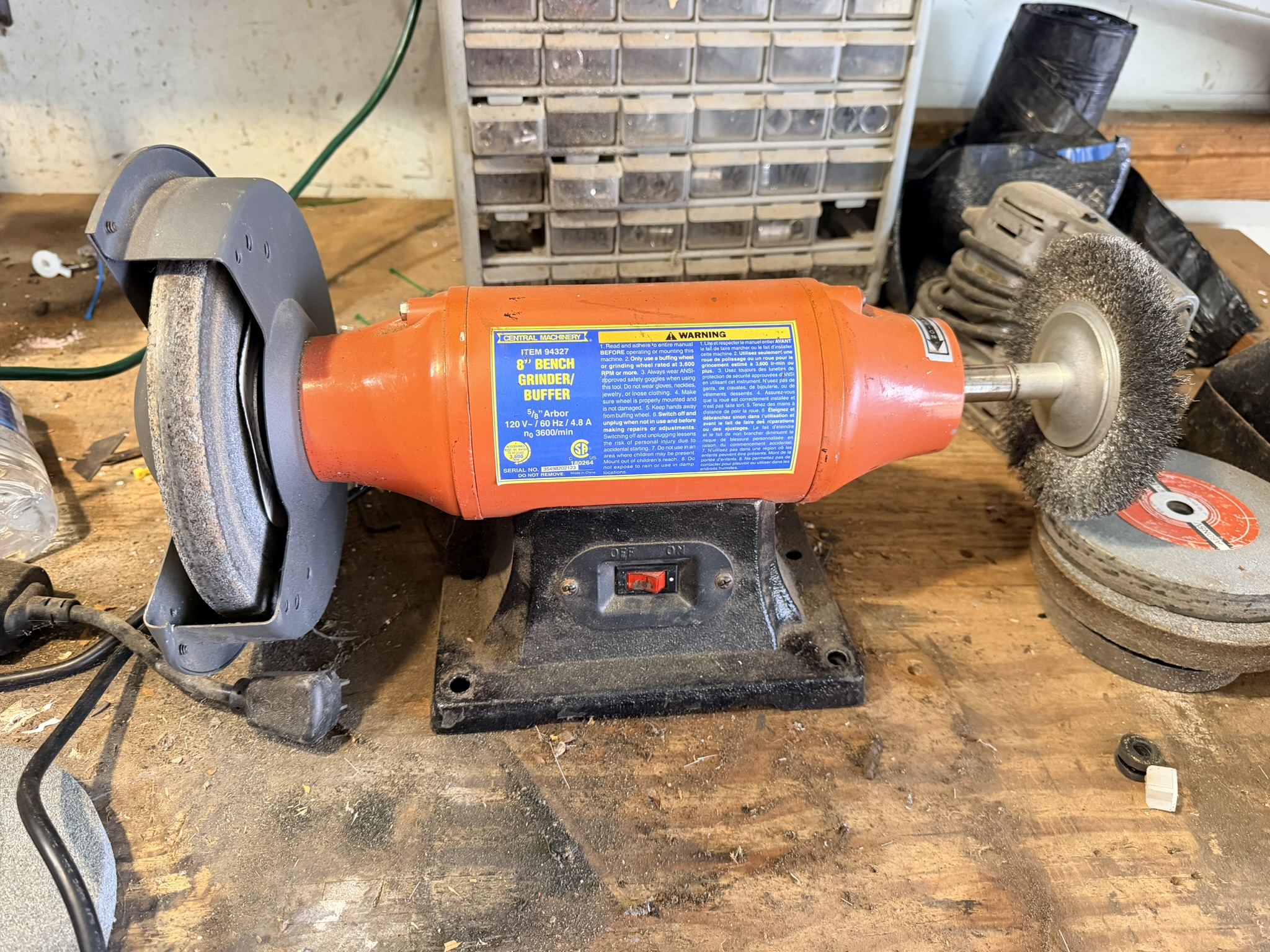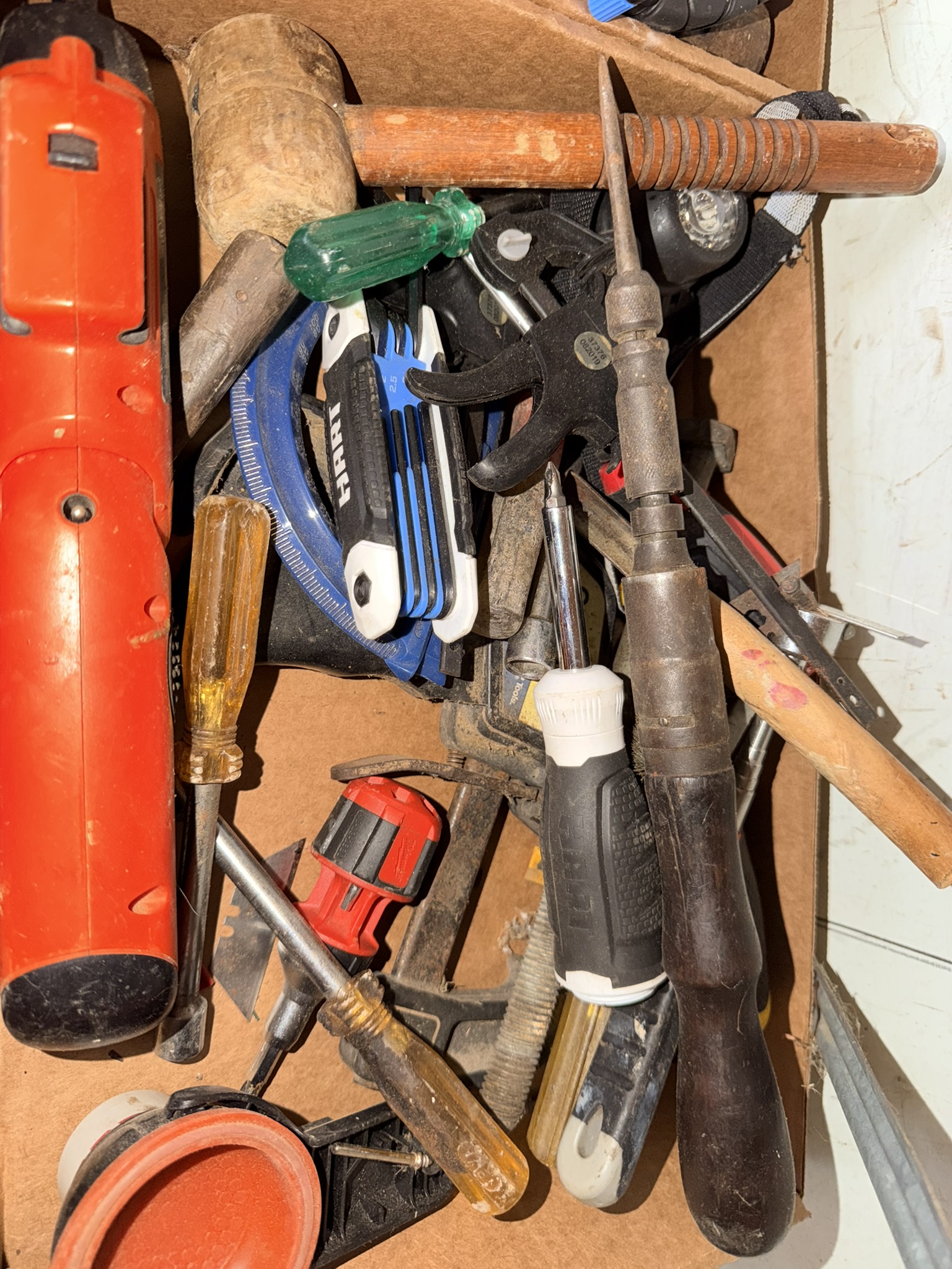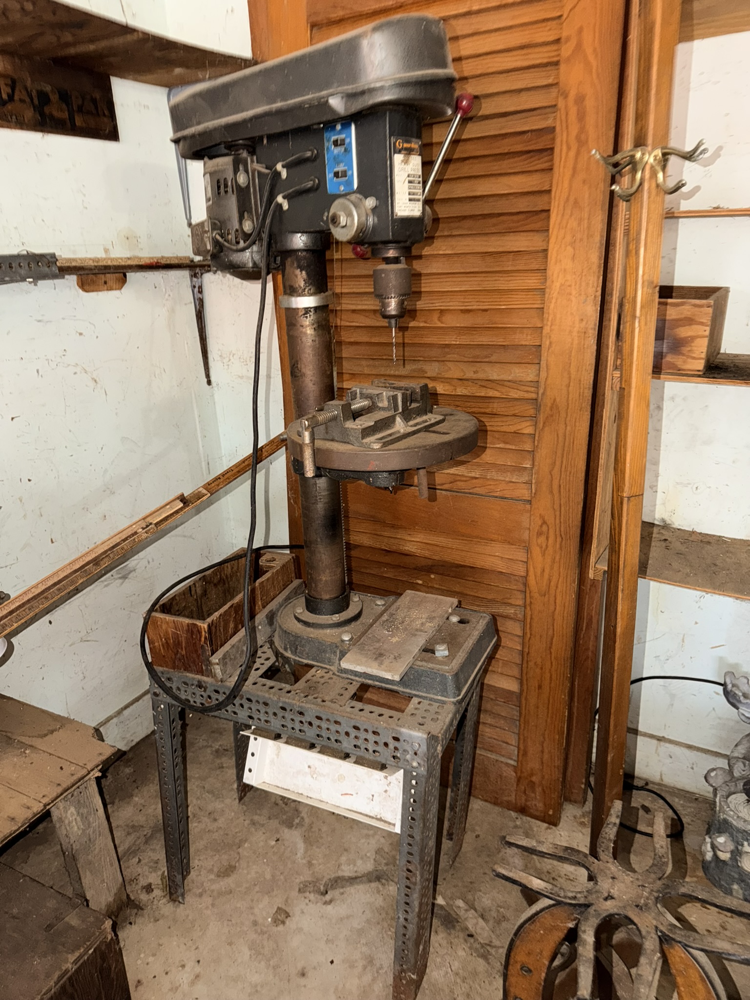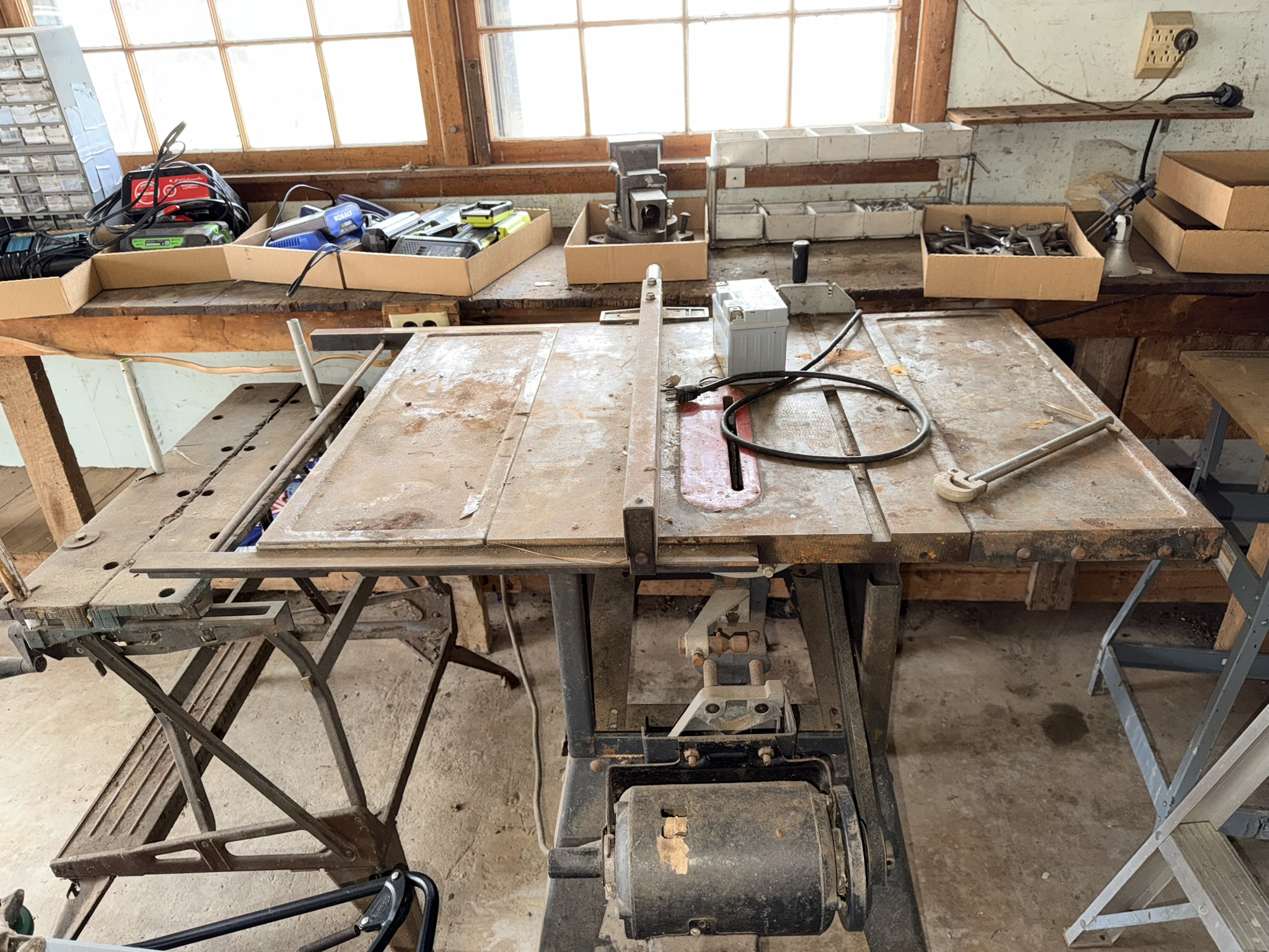 16 ft extendable ladder (All American), Black & Decker pressure washer, large assortment of hand tools including pliers, wrenches, screwdrivers, hammers, saws, rakes, axes, brooms, shovels and more, red metal rolling toolbox, gas cans (several sizes), tape measures, sandpaper (many new), shop vac, step stools, metal toolboxes, plastic tool and accessory storage kits, Black & Decker Wood Hawk, 8” bench grinder, multi-compartment storage, Black & Decker handheld sanders, Bostitch electric drill, extension cords, chain, rope, Arctic Air fan, Lasko floor fan, magnetic shop storage, Ego leaf blower, weed eaters, ice melt, window fan unit, Ryobi hedge trimmers, Hyper Tough chainsaw, Ryobi leaf blower, assorted Dremels, lanterns, oscillating multi-tool, Chicago Electric angle grinder, Black & Decker orbital jig saw, Hyper Tough trimmers, Guardian power drill press, Schumacher 10-amp battery charger, #4 bench vise.