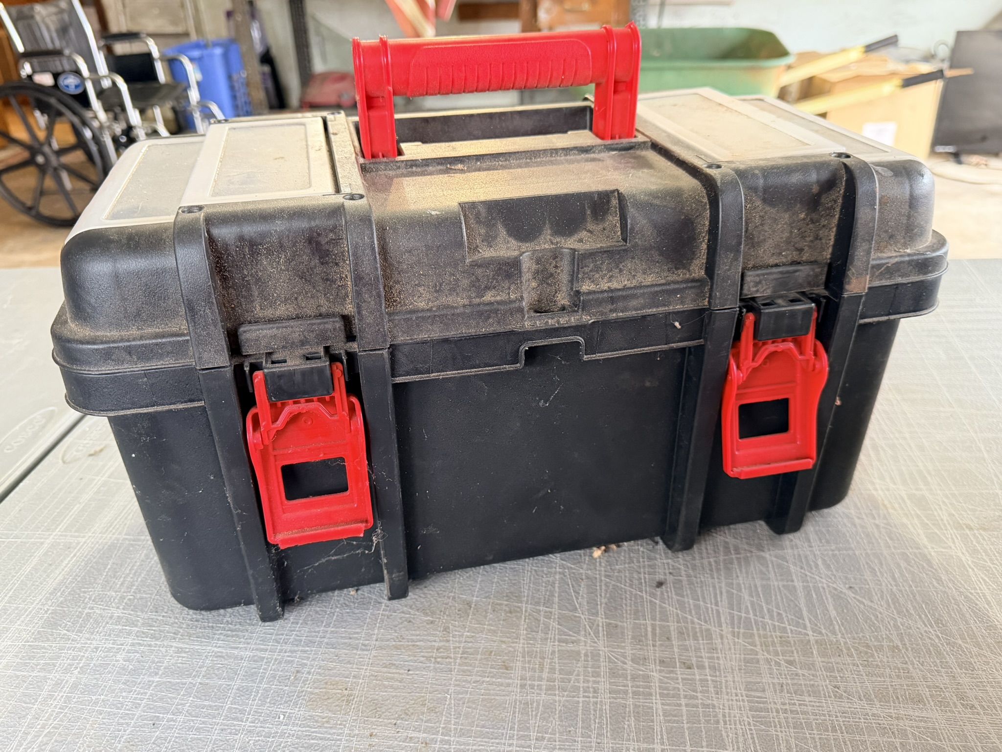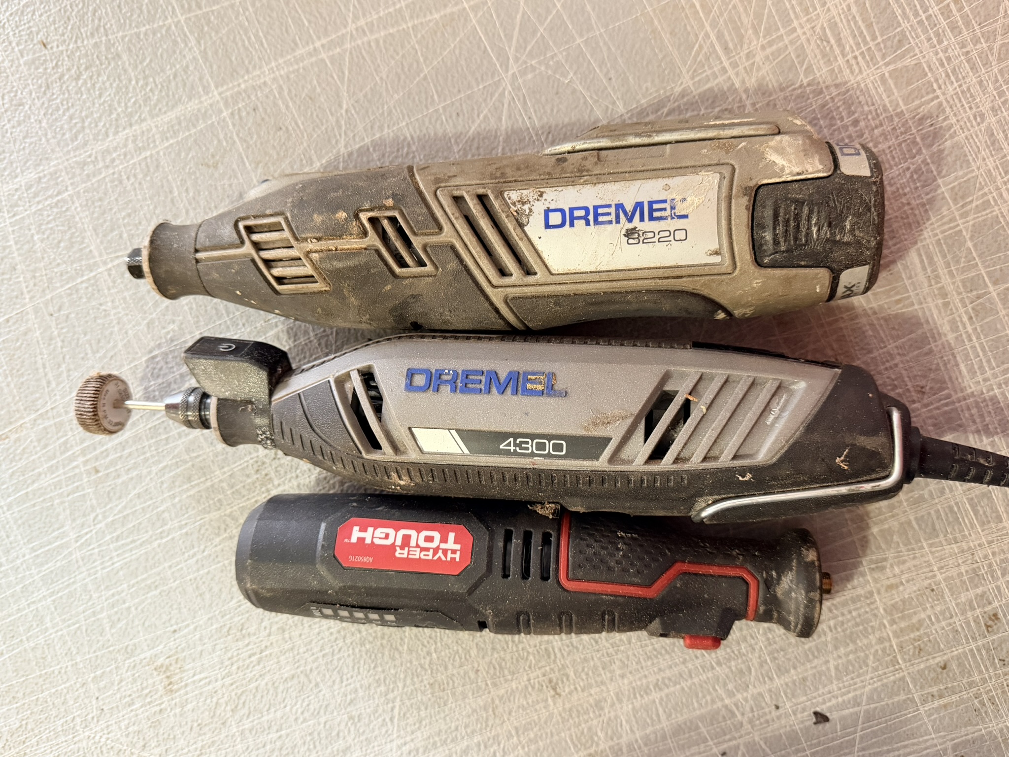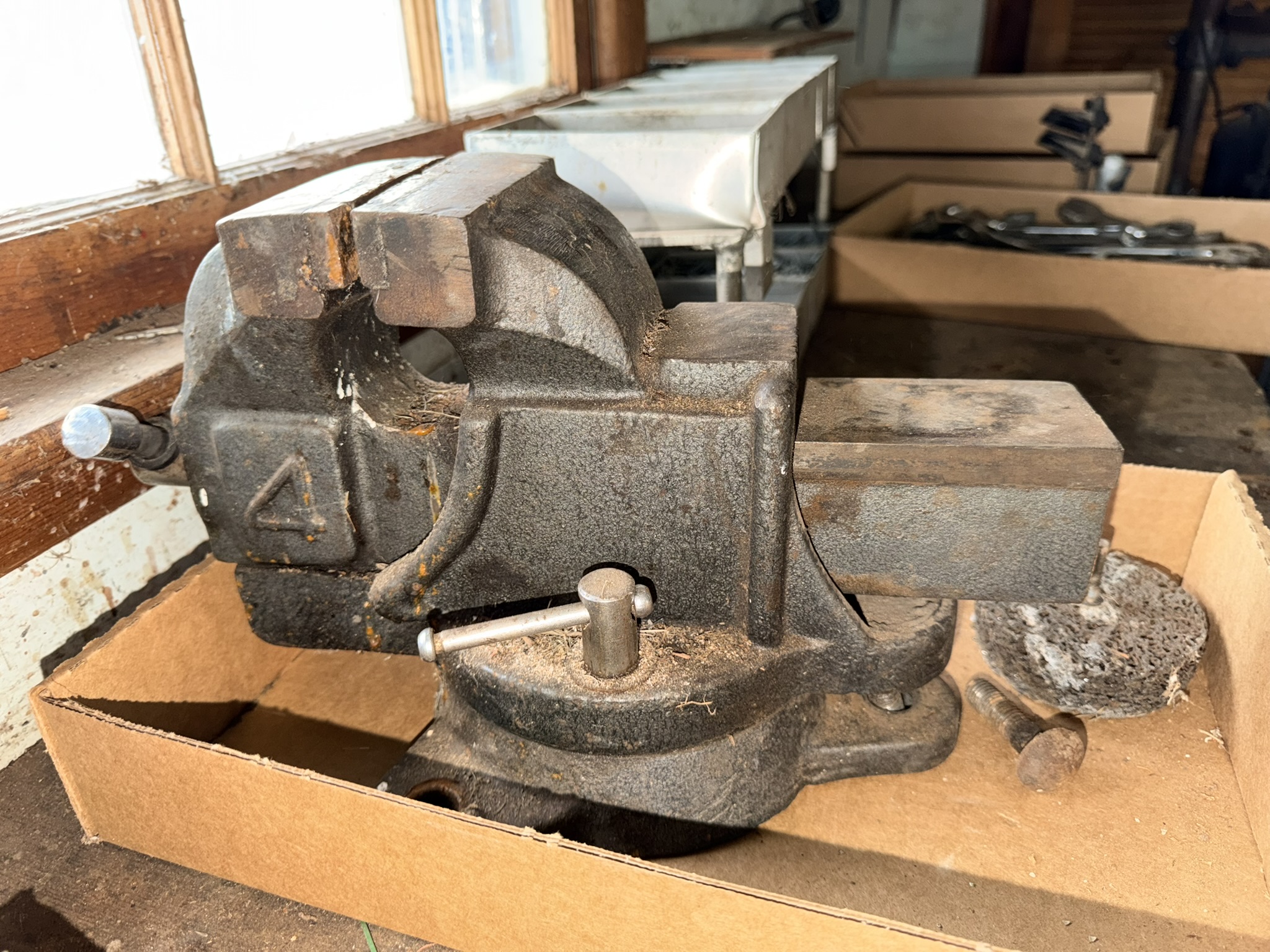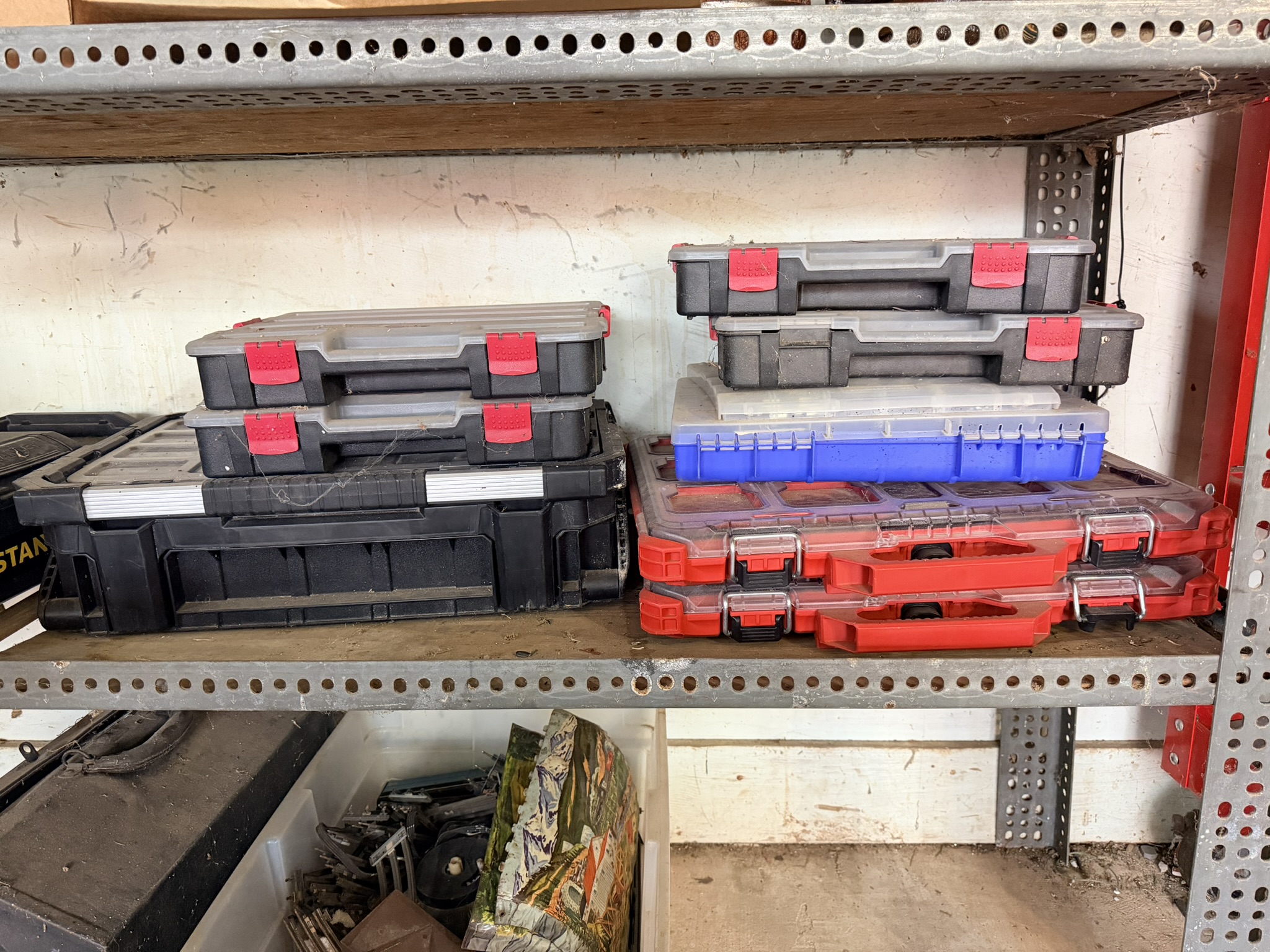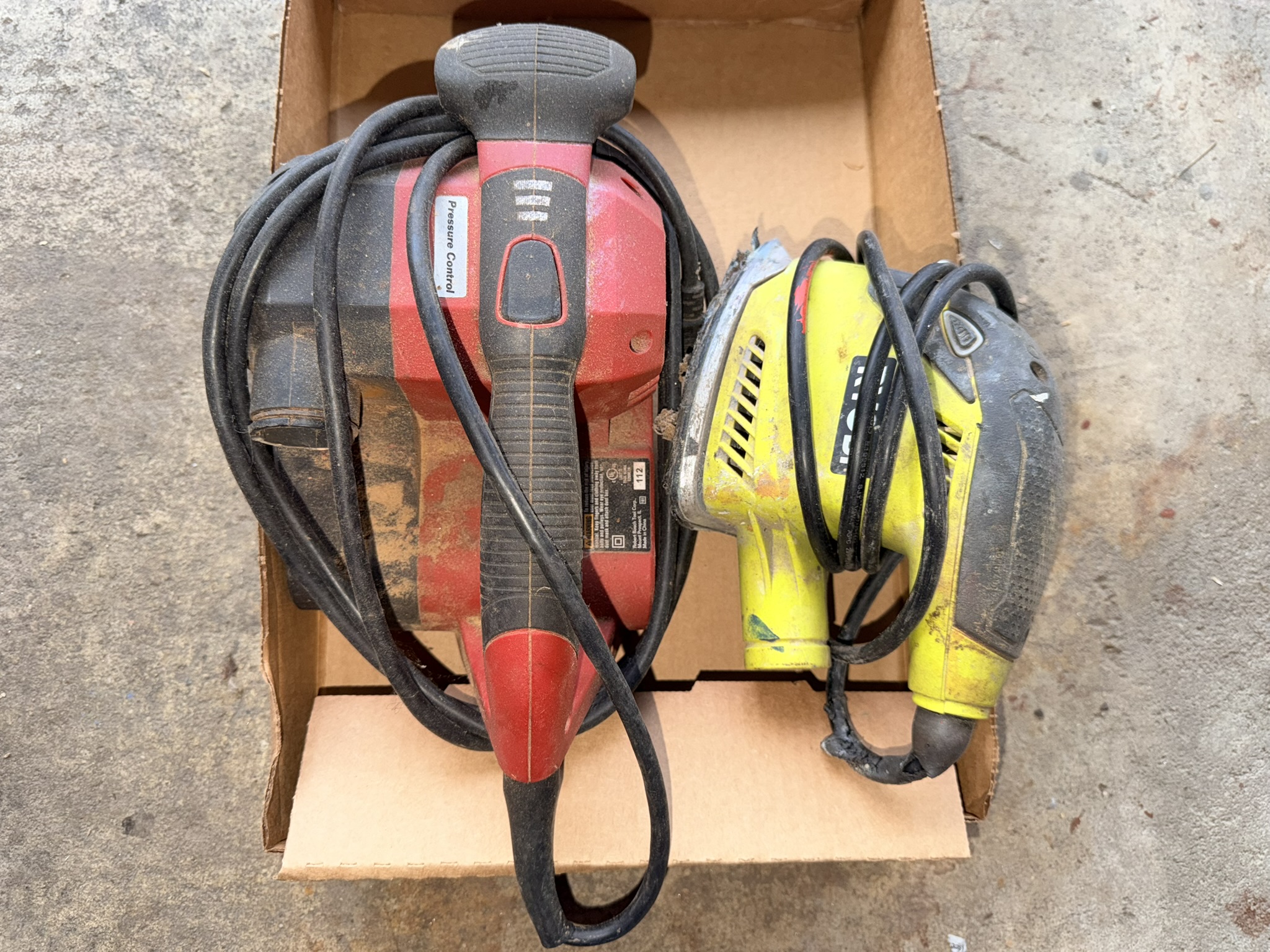 16 ft extendable ladder (All American), Black & Decker pressure washer, large assortment of hand tools including pliers, wrenches, screwdrivers, hammers, saws, rakes, axes, brooms, shovels and more, red metal rolling toolbox, gas cans (several sizes), tape measures, sandpaper (many new), shop vac, step stools, metal toolboxes, plastic tool and accessory storage kits, Black & Decker Wood Hawk, 8” bench grinder, multi-compartment storage, Black & Decker handheld sanders, Bostitch electric drill, extension cords, chain, rope, Arctic Air fan, Lasko floor fan, magnetic shop storage, Ego leaf blower, weed eaters, ice melt, window fan unit, Ryobi hedge trimmers, Hyper Tough chainsaw, Ryobi leaf blower, assorted Dremels, lanterns, oscillating multi-tool, Chicago Electric angle grinder, Black & Decker orbital jig saw, Hyper Tough trimmers, Guardian power drill press, Schumacher 10-amp battery charger, #4 bench vise.
