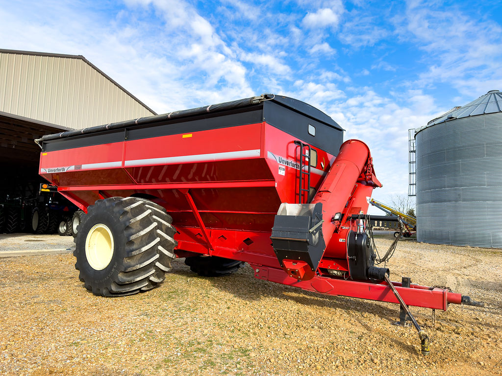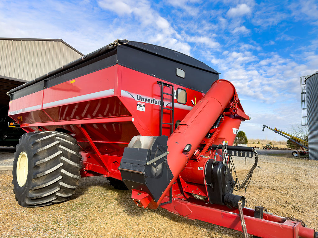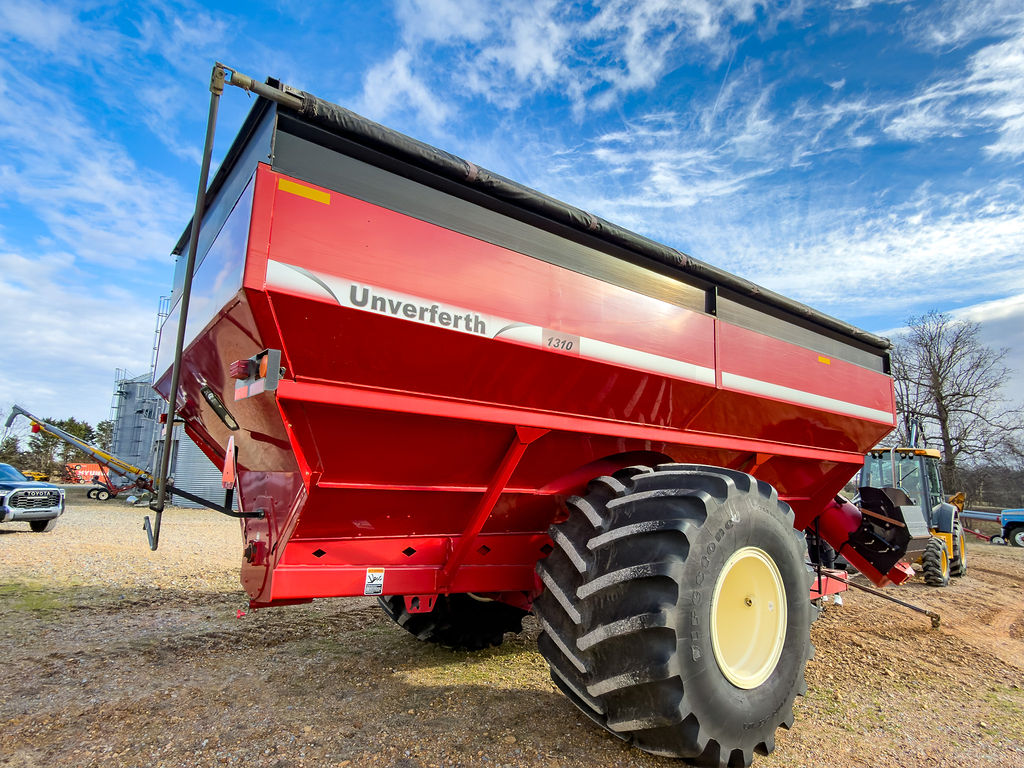 Unverferth grain cart model 1310 equipped with roll tarp, Firestone 1250/45-32 tires, and hydraulic-adjust spout.