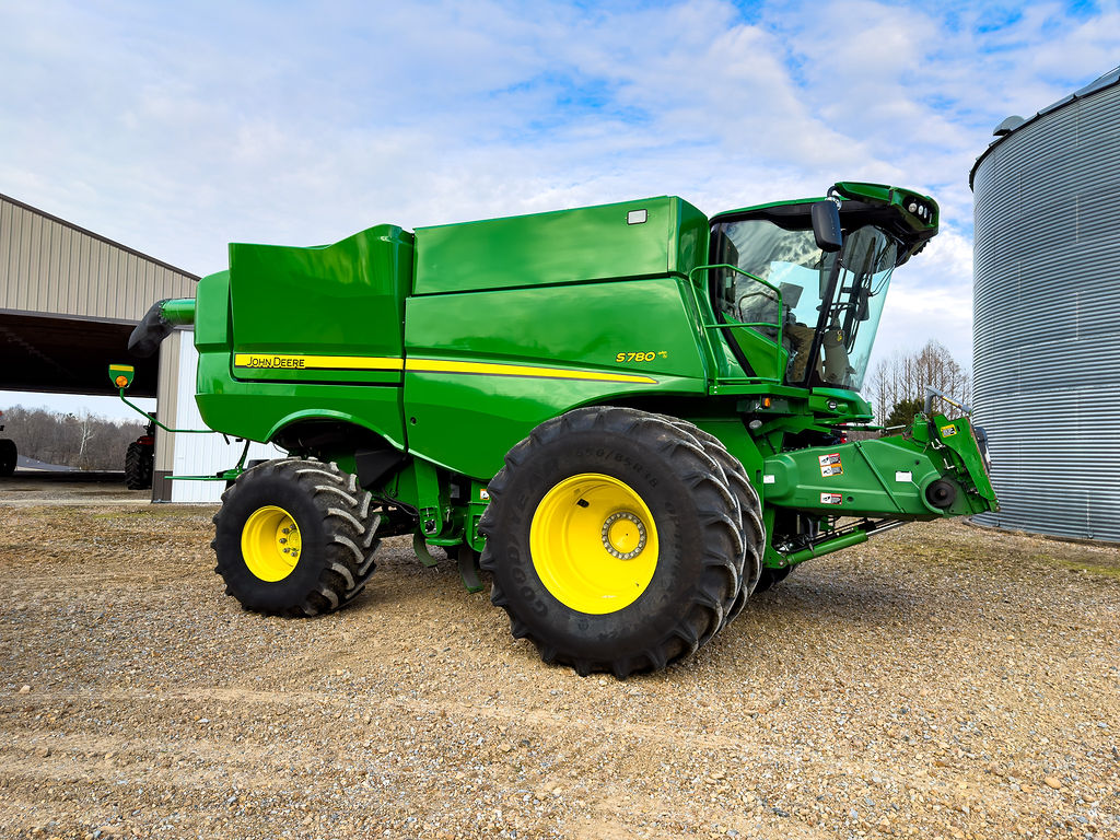 John Deere S780 combine, year 2020, 945.5 separator hours and 1,325 engine hours, equipped with ProDrive transmission, chopper, PowerCast tailboard, Contour Master, and power fold extension. Equipped with 650/85R38 front dual tires and 750/65R26 rear tires.