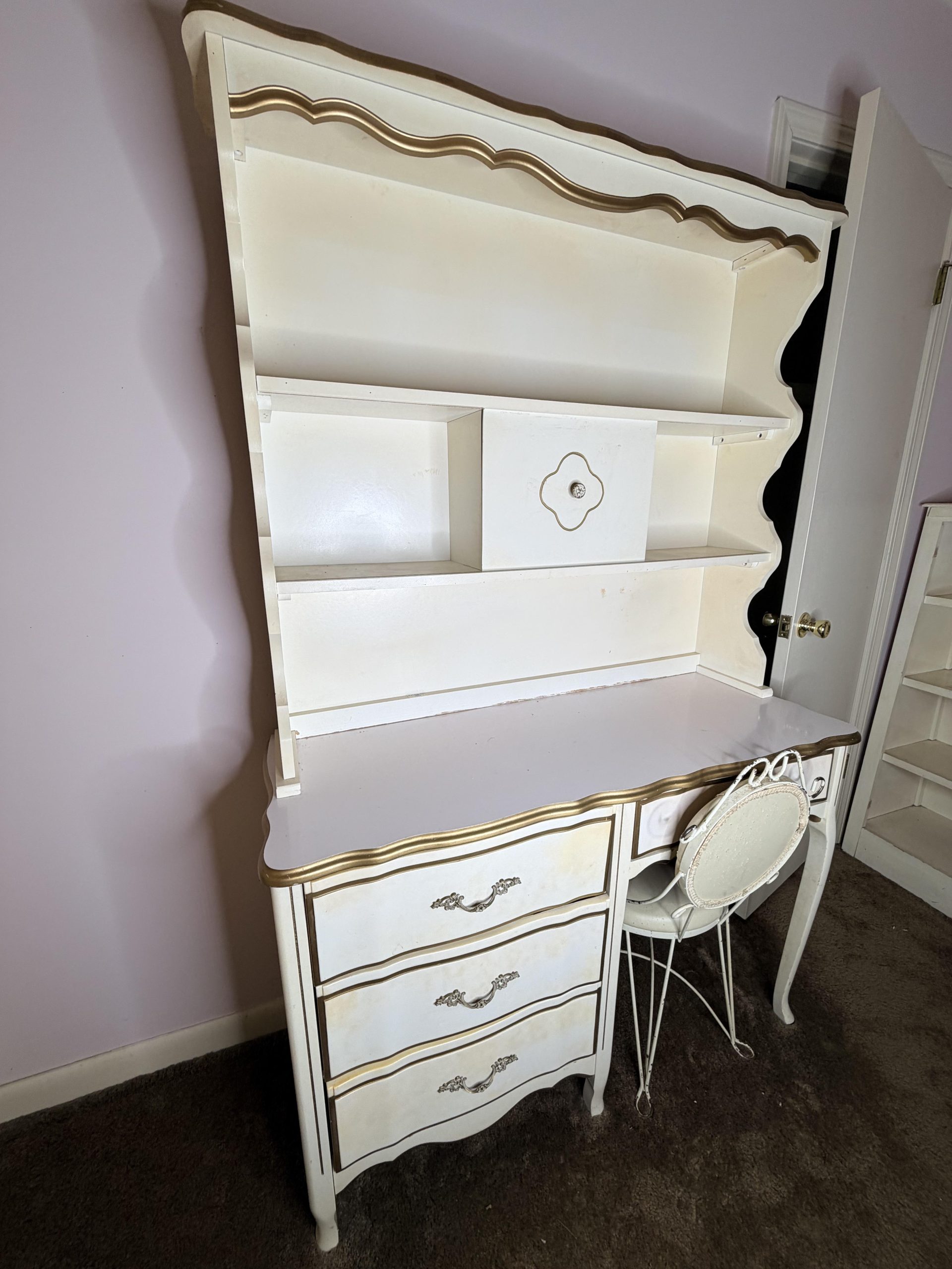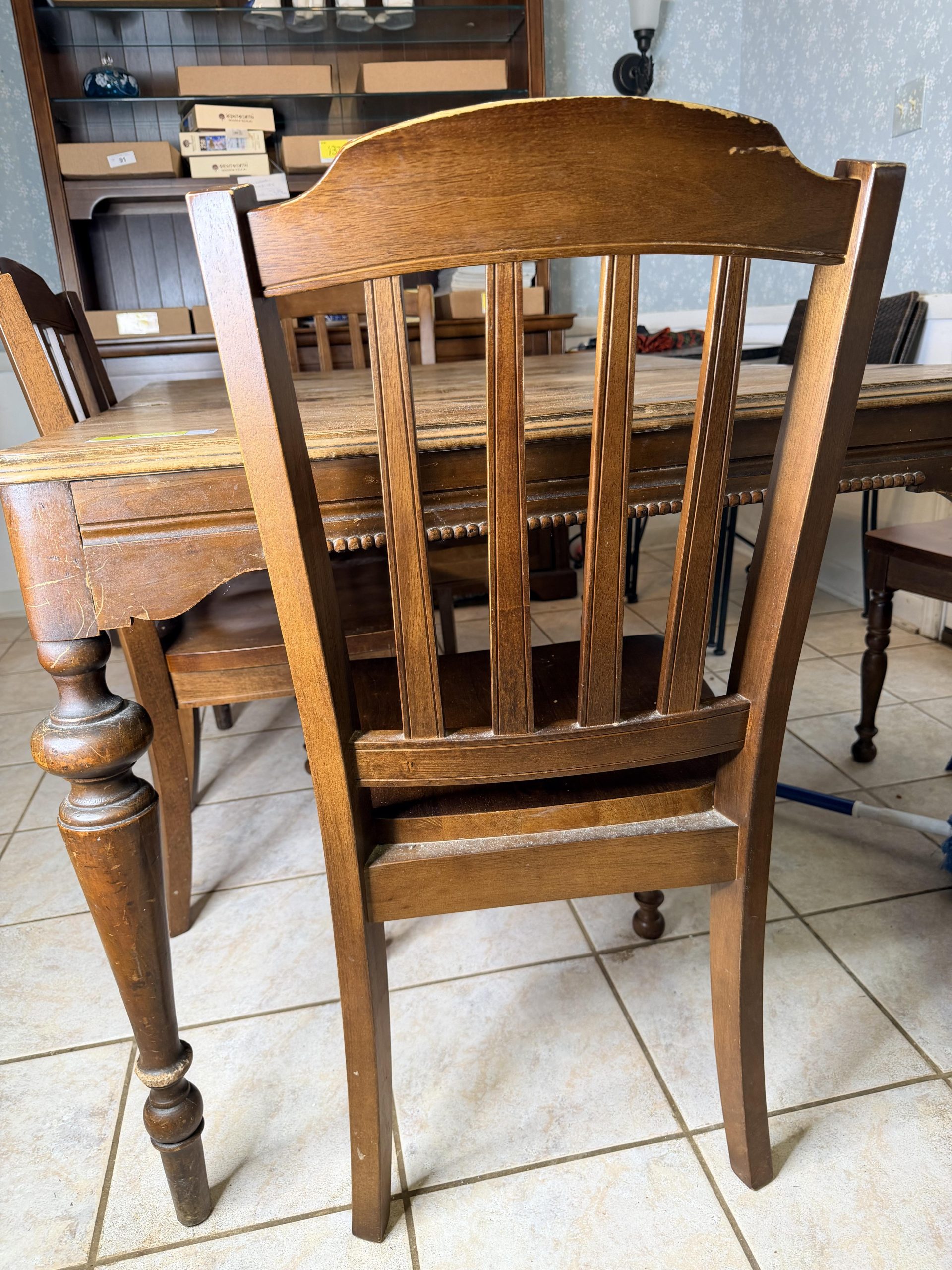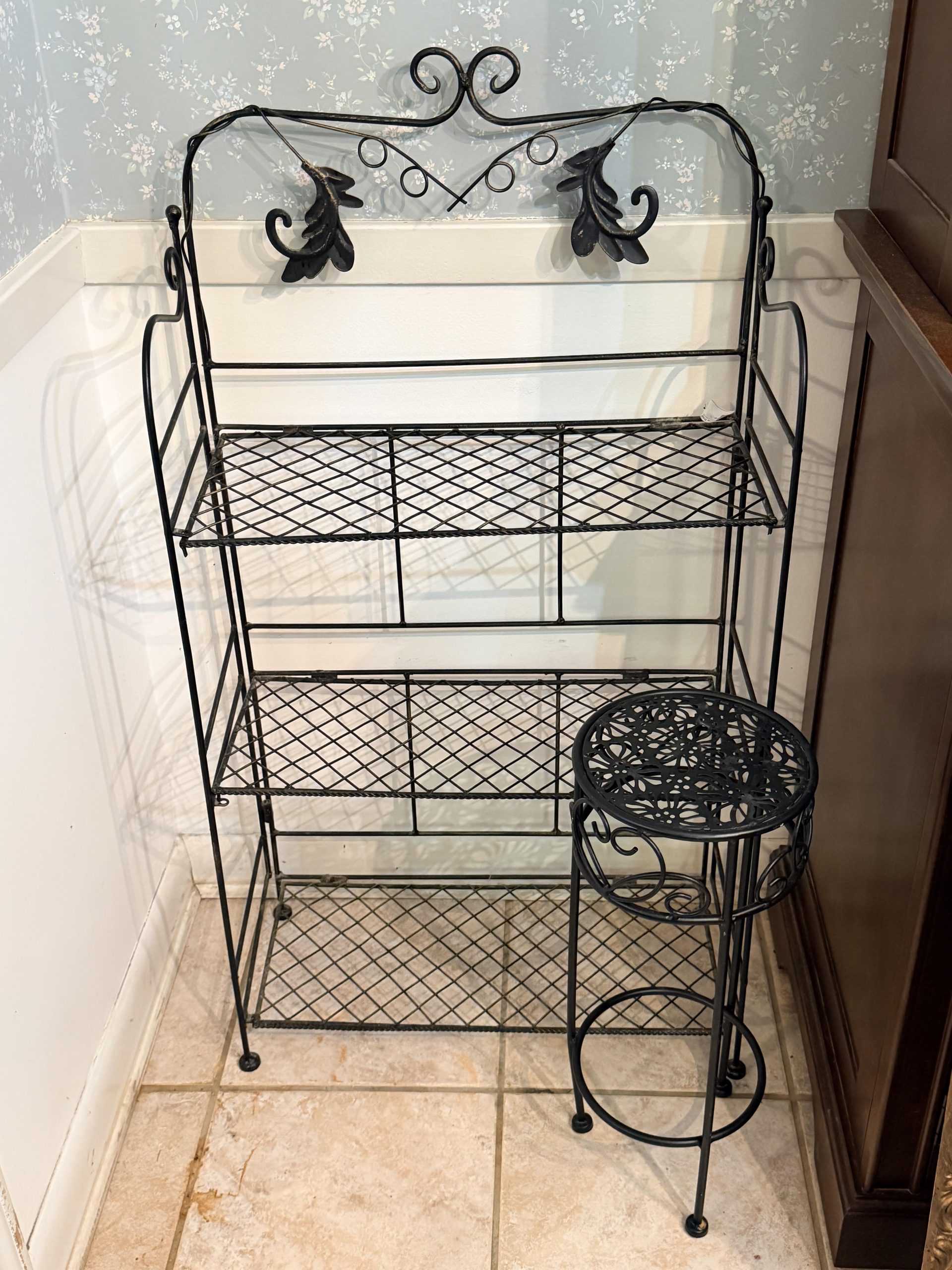 The auction includes a wide selection of furniture, including a farmhouse-style wooden shelf unit, metal shelf and plant stand, antique secretary desk, bistro glass-top table with two chairs, wooden dining table with eight chairs, bedroom furniture sets, bedroom suite with bed, dresser, armoire and side table, living room entertainment cabinet, round pedestal table, side tables, and a home décor assortment with wooden shelving.