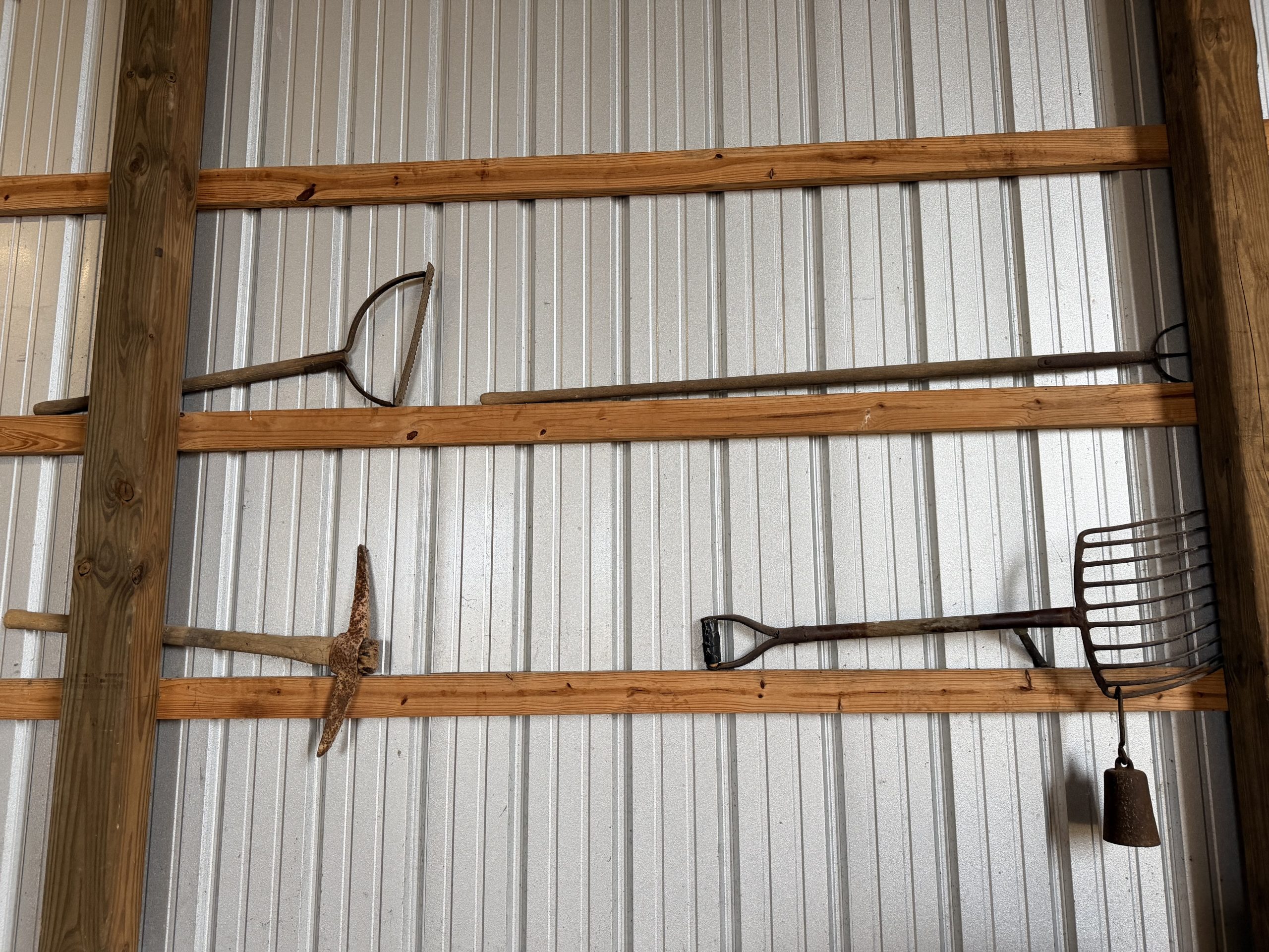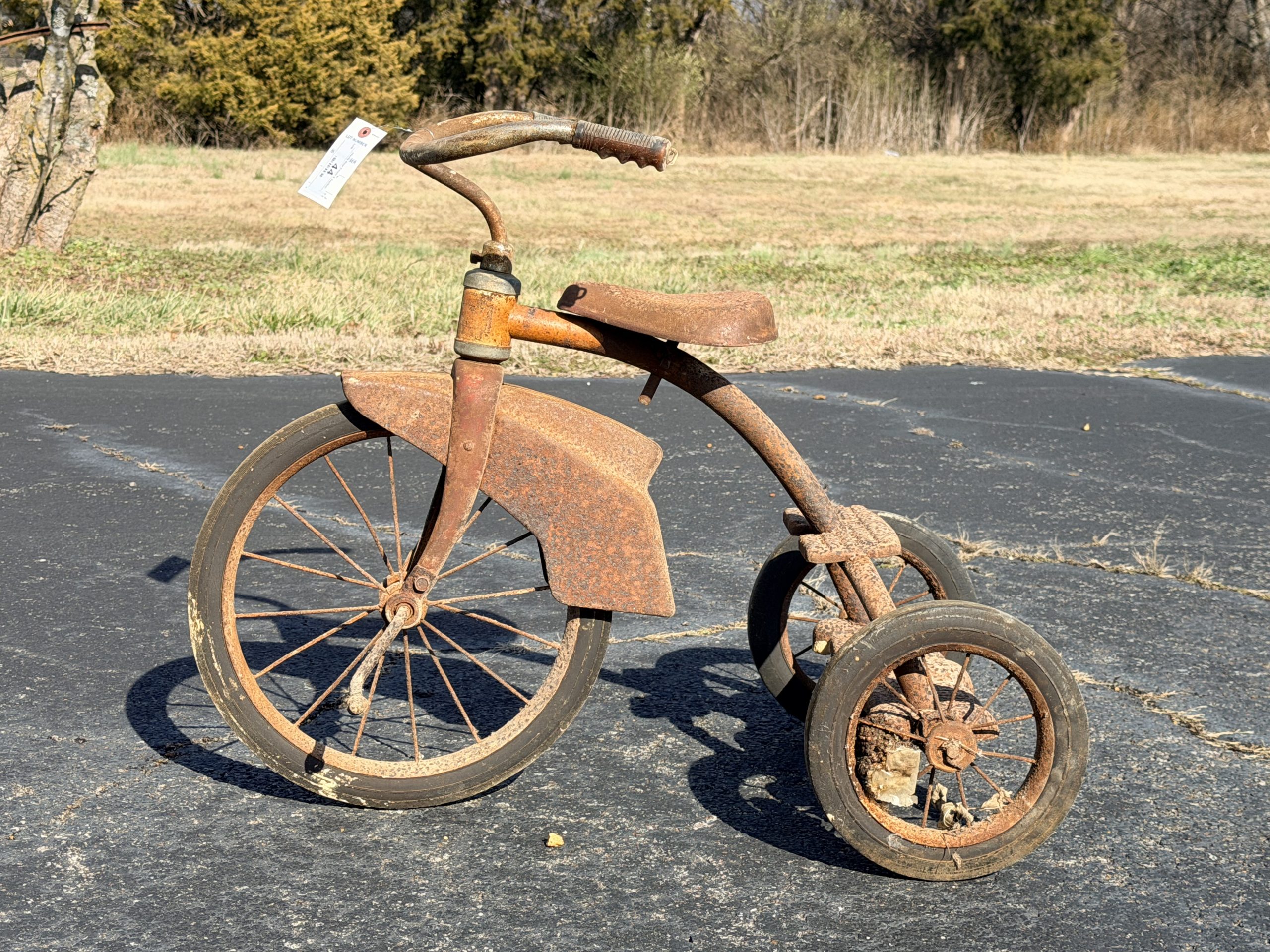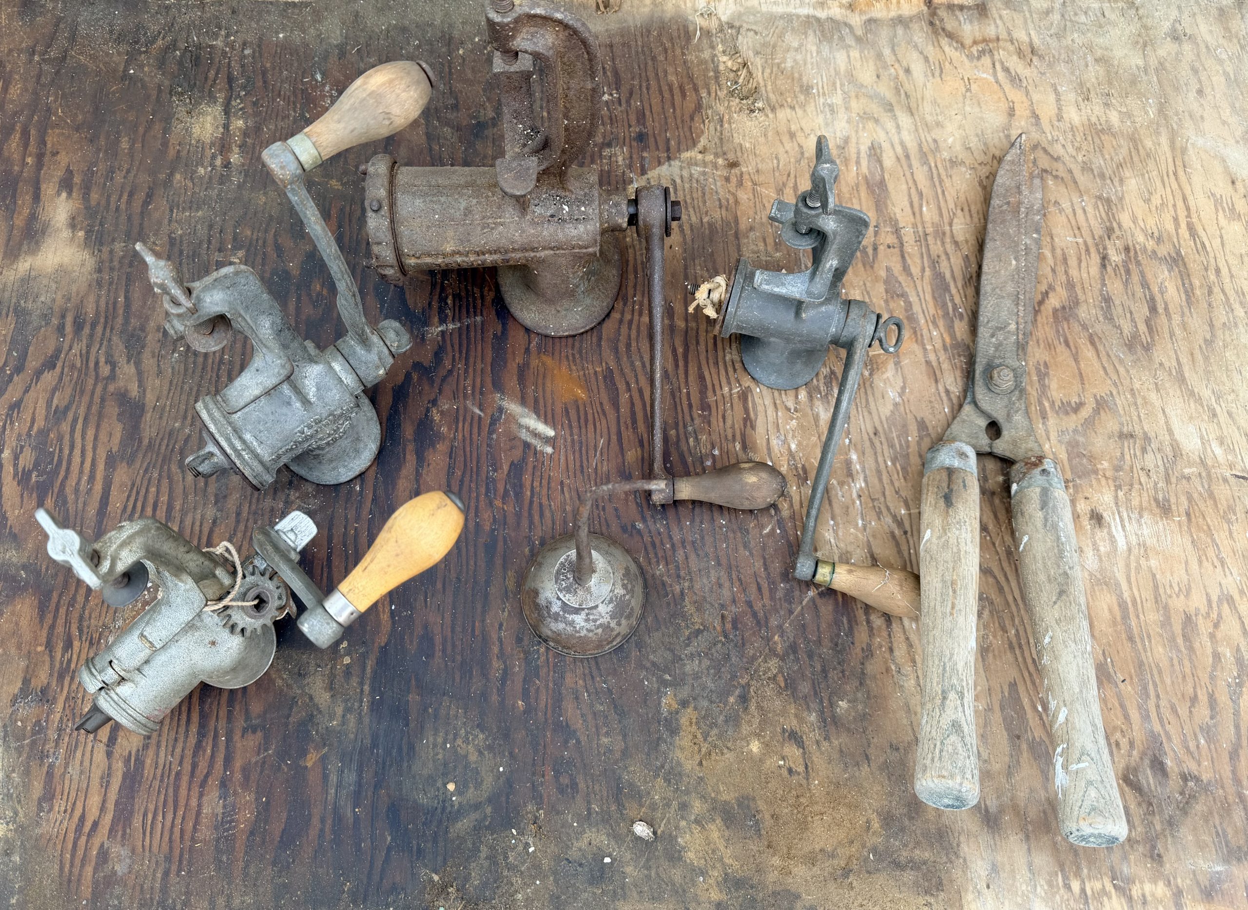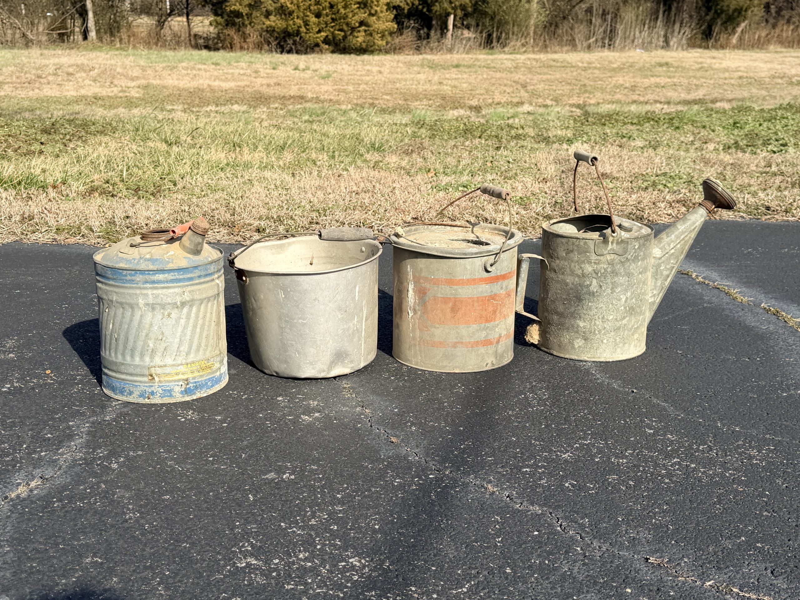 Two Cast Iron Kettles, Cast Iron Kettle, Vintage Red Painted Wooden Rocking Horse, Antique Corn Sheller, Antique Children’s Tricycle, Western Flyer Pedal Car, Child Antique Pedal Car, Blue Mason Jars, Cast Iron Kettle Tray, Antique Or Vintage High Chair, Enamelware Black And White Pitcher And Basin, Vintage Metal Milk Can, Vintage Cooking Tools / Meat Grinders, Blue Dietz Lantern, Sunnyland Antique Wash Board.