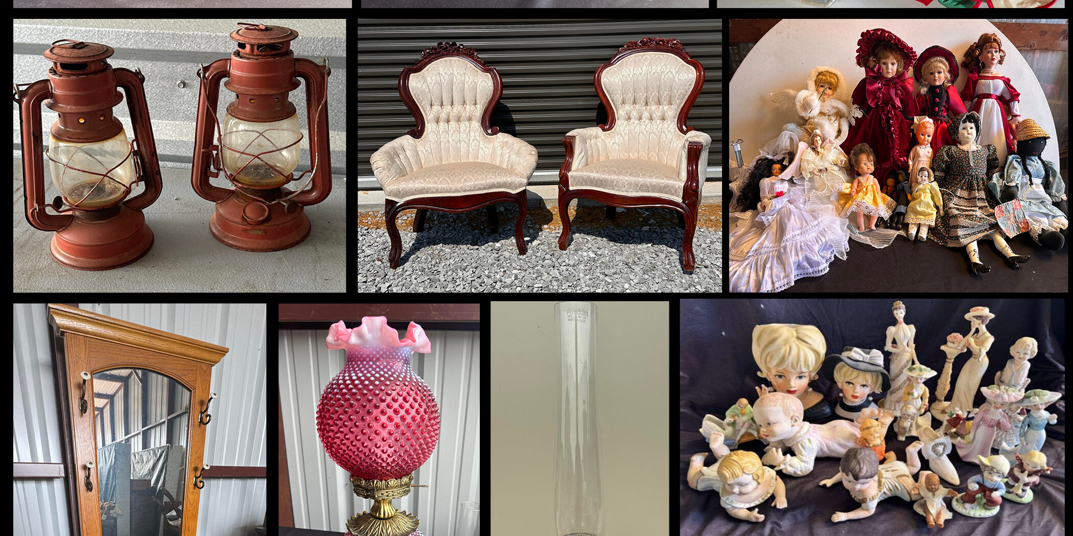 Antiques and Vintage Collectibles: Postage stamp book- includes stamps on miscellaneous pages, Pair of Coca Cola tin trays Mini Coca-Cola bottle holders, “Ceramic Aunt Jemimas Great Aunt Jemima Ceramic thread spool holder, Aunt Jemima ceramic collectible, Aunt Jemimah butter churner, Iron Horse Drawn Cart, Vintage Desk Telephone, Shoehorn, Wooden antique mallet, Wooden wagon, Wooden display case, Galvanized tub, Red Dietz rail road lantern, Ceramic aunt Jemima figurine, Vintage glass coke bottles, Antique seed sowing bag, Antique wooden tray with handheld tools, suit case rack with floral embroidered straps, Vintage accessories Iron horseshoe umbrella stand, Old wood stirrup, 2 Vintage metal shoe stretcher, Vintage hand drill, Vintage measuring cup, Large 2 sided spoon vintage buttons, Antique clothes irons, Vintage miner lunch box, Antique porcelain doll Porcelain doll with black hair and blue dress, Masons floral print porcelain jar & lid Made in England, Blue mason jars, Blue #13 mason jar, 8 gallon crock, Wooden gun rack, and wall shelf, Paper cutter, 2 Antique Glass/Porcelain dolls, Spirit of St Louis table top juke box antique porcelain dolls, National washboard CO wooden washboard, Goodyear and John Deere vehicles, Antique blender, Vintage check embossing machine, Radio flyer mini wagon, Blue mason jar grouping, Sewing mice music box, Porcelain dolls, antique dolls, Barbie dolls, 8 pc. Antique Mini Furniture, Collection of Belt Buckles Various Brand and Engravings, Upright Record Player Model XII, Vintage train track, Vintage Car Assortment Lot:1966 Chevy C10 Fleetside Pickup, 1937 Ford Pickup, 1955 Mercedes Benz 190 SL, Stetson hat